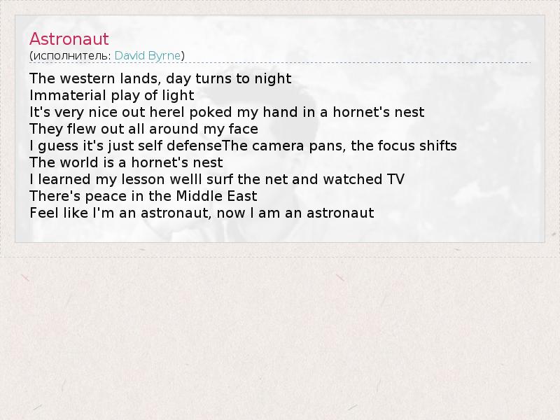 Это интересно:Дэвид Бирн (David Byrne) родился в Дамбартоне, Шотландия, 14 мая 1952 года. Когда ему было 2 года, вместе со своими родителями он переехал в Канаду, где его отцу и матери предложили выгодную работу. Когда Дэвиду было 9 лет, он вместе со своей семьей вновь меняет место жительства. На сей раз они перебираются к предместьям Балтимора Штата Мэриленд. В сентябре 1970 года закончив высшую школу, Дэвид... продолжение