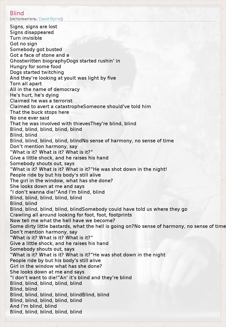 Signs, signs are lost Signs disappeared Turn invisible Got no sign Somebody got busted Got a face of stone and a Ghostwritten biographyDogs started rushin' in Hungry for some food Dogs started twitching And they're looking at youIt was light by five Torn all apart All in the name of democracy He's hurt, he's dying Claimed he was a terrorist Claimed to avert a catastropheSomeone should've told him That the buck stops here No one ever said That he was involved with thievesThey're blind, blind Blind, blind, blind, blind, blind Blind, blind Blind, blind, blind, blind, blindNo sense of harmony, no sense of time Don't mention harmony, say "What is it? What is it? What is it?" Give a little shock, and he raises his hand Somebody shouts out, says "What is it? What is it? What is it?"He was shot down in the night! People ride by but his body's still alive The girl in the window, what has she done? She looks down at me and says "I don't wanna die!"And I'm blind, blind Blind, blind, blind, blind, blind Blind, blind Blind, blind, blind, blind, blindSomebody could have told us where they go Crawling all around looking for foot, foot, footprints Now tell me what the hell have we become? Some dirty little bastards, what the hell is going on?No sense of harmony, no sense of time Don't mention harmony, say "What is it? What is it? What is it?" Give a little shock, and he raises his hand Somebody shouts out, says "What is it? What is it? What is it?"He was shot down in the night People ride by but his body's still alive Girl in the window what has she done? She looks down at me and says "I don't want to die!"An' it's blind and they're blind Blind, blind, blind, blind, blind Blind, blind Blind, blind, blind, blind, blindBlind, blind Blind, blind, blind, blind, blind And I'm blind, blind Blind, blind, blind, blind, blind