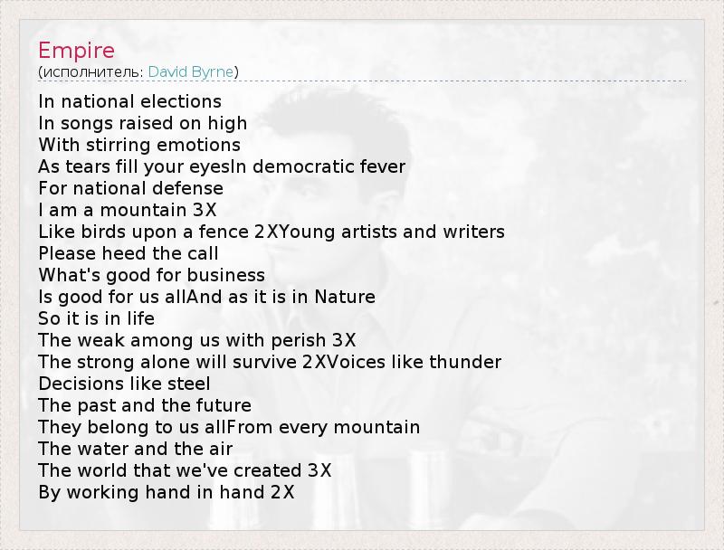 Это интересно:Дэвид Бирн (David Byrne) родился в Дамбартоне, Шотландия, 14 мая 1952 года. Когда ему было 2 года, вместе со своими родителями он переехал в Канаду, где его отцу и матери предложили выгодную работу. Когда Дэвиду было 9 лет, он вместе со своей семьей вновь меняет место жительства. На сей раз они перебираются к предместьям Балтимора Штата Мэриленд. В сентябре 1970 года закончив высшую школу, Дэвид... продолжение