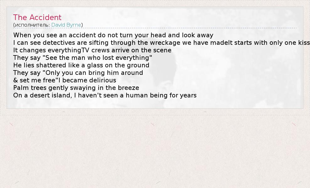 Это интересно:Дэвид Бирн (David Byrne) родился в Дамбартоне, Шотландия, 14 мая 1952 года. Когда ему было 2 года, вместе со своими родителями он переехал в Канаду, где его отцу и матери предложили выгодную работу. Когда Дэвиду было 9 лет, он вместе со своей семьей вновь меняет место жительства. На сей раз они перебираются к предместьям Балтимора Штата Мэриленд. В сентябре 1970 года закончив высшую школу, Дэвид... продолжение
