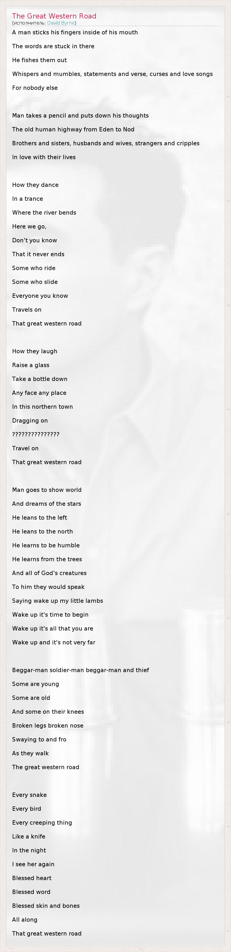 A man sticks his fingers inside of his mouth The words are stuck in there He fishes them out Whispers and mumbles, statements and verse, curses and love songs For nobody else Man takes a pencil and puts down his thoughts The old human highway from Eden to Nod Brothers and sisters, husbands and wives, strangers and cripples In love with their lives How they dance In a trance Where the river bends Here we go, Don't you know That it never ends Some who ride Some who slide Everyone you know Travels on That great western road How they laugh Raise a glass Take a bottle down Any face any place In this northern town Dragging on ??????????????? Travel on That great western road Man goes to show world And dreams of the stars He leans to the left He leans to the north He learns to be humble He learns from the trees And all of God's creatures To him they would speak Saying wake up my little lambs Wake up it's time to begin Wake up it's all that you are Wake up and it's not very far Beggar-man soldier-man beggar-man and thief Some are young Some are old And some on their knees Broken legs broken nose Swaying to and fro As they walk The great western road Every snake Every bird Every creeping thing Like a knife In the night I see her again Blessed heart Blessed word Blessed skin and bones All along That great western road