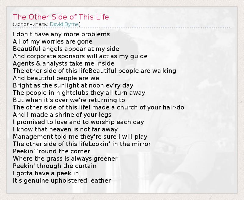 А как ты думаешь, о чем песня "The Other Side of This Life" ?