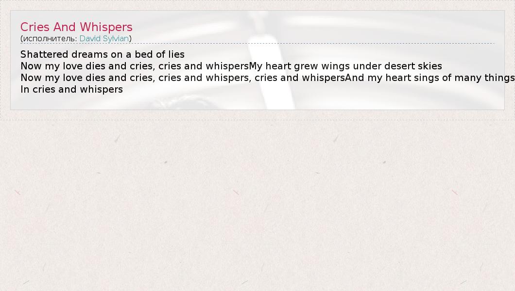 А как ты думаешь, о чем песня "Cries And Whispers" ?