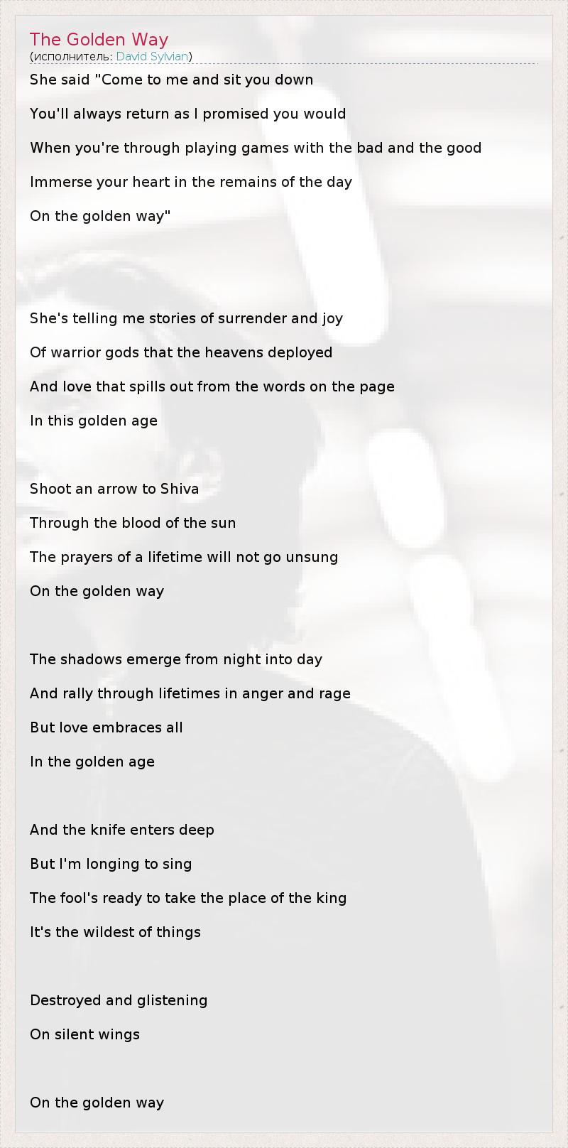 She said "Come to me and sit you down You'll always return as I promised you would When you're through playing games with the bad and the good Immerse your heart in the remains of the day On the golden way" She's telling me stories of surrender and joy Of warrior gods that the heavens deployed And love that spills out from the words on the page In this golden age Shoot an arrow to Shiva Through the blood of the sun The prayers of a lifetime will not go unsung On the golden way The shadows emerge from night into day And rally through lifetimes in anger and rage But love embraces all In the golden age And the knife enters deep But I'm longing to sing The fool's ready to take the place of the king It's the wildest of things Destroyed and glistening On silent wings On the golden way