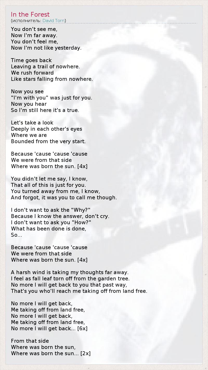 You don't see me, Now I'm far away. You don't feel me, Now I'm not like yesterday. Time goes back Leaving a trail of nowhere. We rush forward Like stars falling from nowhere. Now you see "I'm with you" was just for you. Now you hear So I'm still here it's a true. Let's take a look Deeply in each other's eyes Where we are Bounded from the very start. Because 'cause 'cause 'cause We were from that side Where was born the sun. [4x] You didn't let me say, I know, That all of this is just for you. You turned away from me, I know, And forgot, it was you to call me though. I don't want to ask the "Why?" Because I know the answer, don't cry. I don't want to ask you "How?" What has been done is done, So... Because 'cause 'cause 'cause We were from that side Where was born the sun. [4x] A harsh wind is taking my thoughts far away. I feel as fall leaf torn off from the garden tree. No more I will get back to you that past way, That's you who'll reach me taking off from land free. No more I will get back, Me taking off from land free, No more I will get back, Me taking off from land free, No more I will get back... [6x] From that side Where was born the sun, Where was born the sun... [2x]