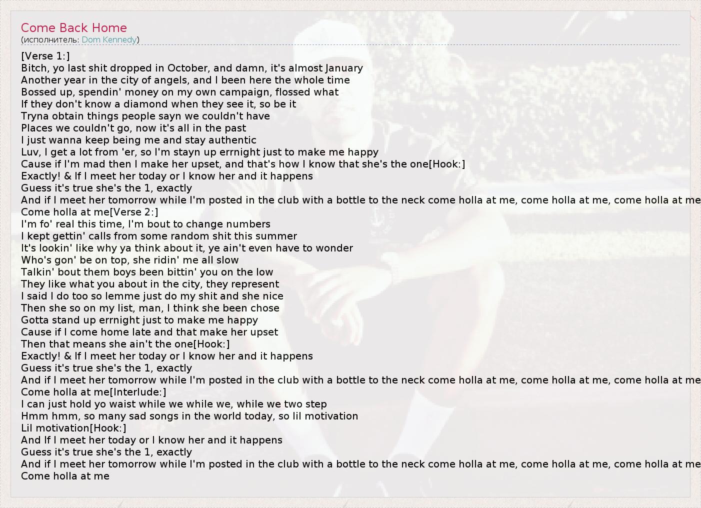 Это интересно:Dom Kennedy graced the streets of Los Angeles in 2008 with the release of his debut project, entitled 25th Hour. The Leimert Park native made a name for himself by performing at various events and venues including the popular Sneaker Pimps Tour and the world famous House of Blues. The amazing response to his live shows ignited his ambitions to distribute, promote and along with his cousin Jason Madison co-produce the 25th Hour mix-tape, which now stays in heavy rotation on Southern California play-lists. With his witty yet ingenious lyrics, Dom Kennedy has proven that he is not your average West Coast emcee… .. Dom can remember, at the age of 12, when he would listen to the great Hip-Hop records... продолжение