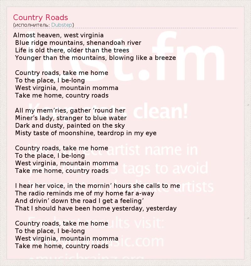 Almost heaven, west virginia Blue ridge mountains, shenandoah river Life is old there, older than the trees Younger than the mountains, blowing like a breeze Country roads, take me home To the place, I be-long West virginia, mountain momma Take me home, country roads All my mem’ries, gather ’round her Miner’s lady, stranger to blue water Dark and dusty, painted on the sky Misty taste of moonshine, teardrop in my eye Country roads, take me home To the place, I be-long West virginia, mountain momma Take me home, country roads I hear her voice, in the mornin’ hours she calls to me The radio reminds me of my home far a-way And drivin’ down the road I get a feeling’ That I should have been home yesterday, yesterday Country roads, take me home To the place, I be-long West virginia, mountain momma Take me home, country roads