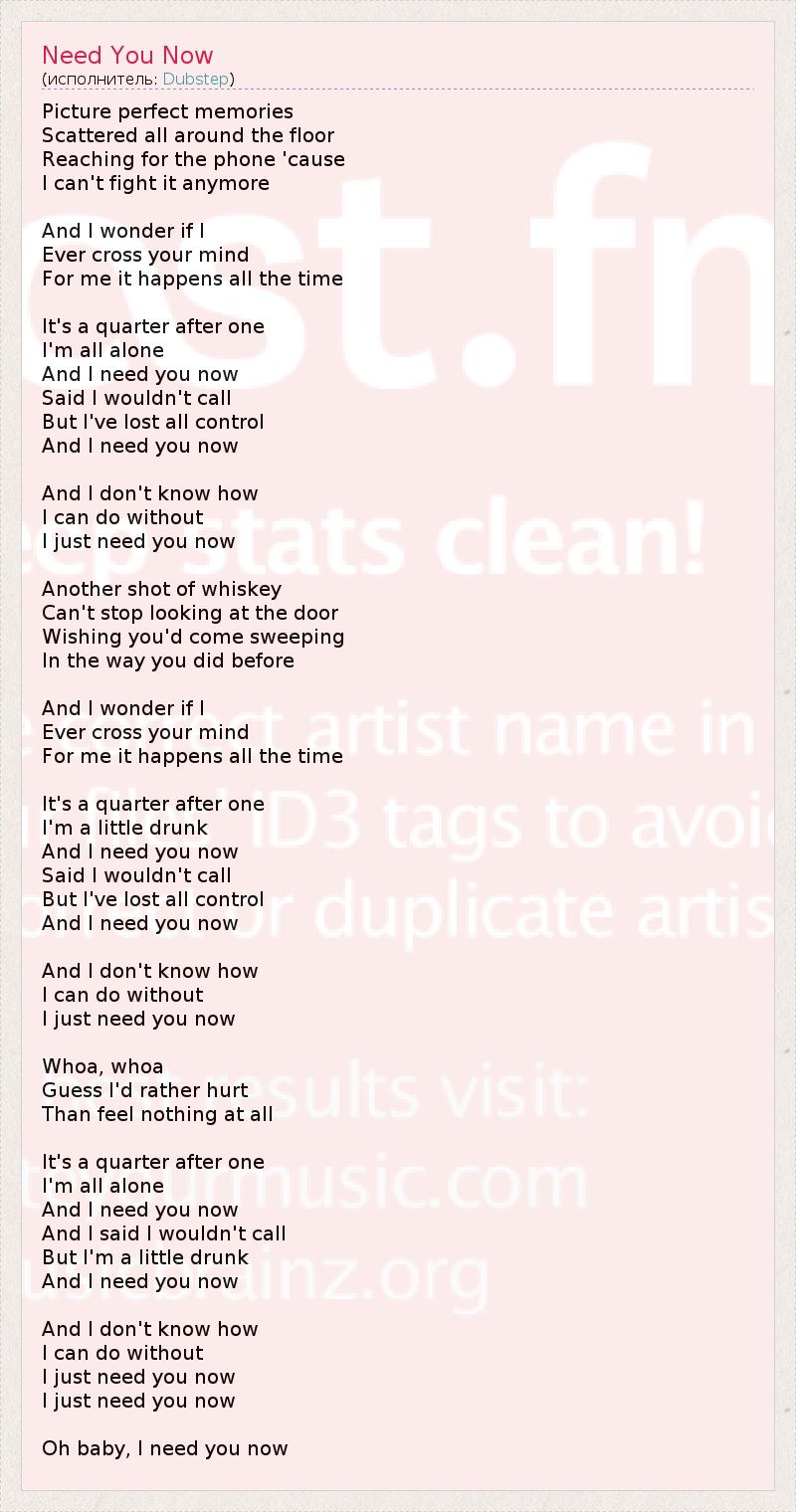 Picture perfect memories Scattered all around the floor Reaching for the phone 'cause I can't fight it anymore And I wonder if I Ever cross your mind For me it happens all the time It's a quarter after one I'm all alone And I need you now Said I wouldn't call But I've lost all control And I need you now And I don't know how I can do without I just need you now Another shot of whiskey Can't stop looking at the door Wishing you'd come sweeping In the way you did before And I wonder if I Ever cross your mind For me it happens all the time It's a quarter after one I'm a little drunk And I need you now Said I wouldn't call But I've lost all control And I need you now And I don't know how I can do without I just need you now Whoa, whoa Guess I'd rather hurt Than feel nothing at all It's a quarter after one I'm all alone And I need you now And I said I wouldn't call But I'm a little drunk And I need you now And I don't know how I can do without I just need you now I just need you now Oh baby, I need you now