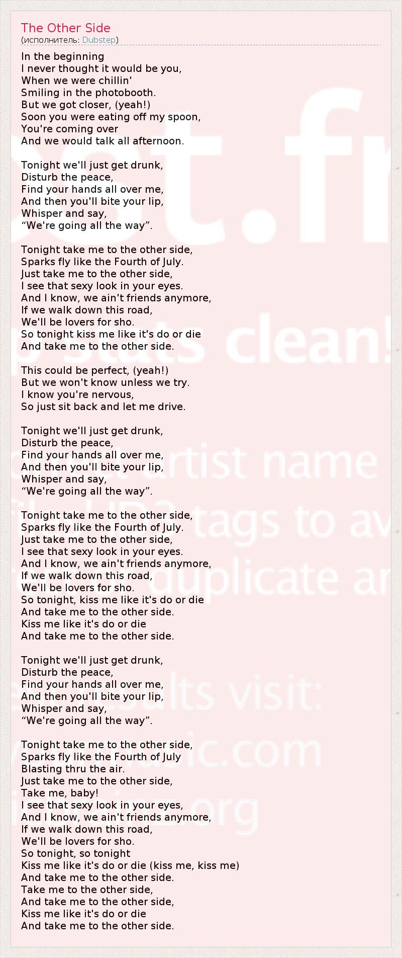 In the beginning I never thought it would be you, When we were chillin' Smiling in the photobooth. But we got closer, (yeah!) Soon you were eating off my spoon, You're coming over And we would talk all afternoon. Tonight we'll just get drunk, Disturb the peace, Find your hands all over me, And then you'll bite your lip, Whisper and say, “We're going all the way”. Tonight take me to the other side, Sparks fly like the Fourth of July. Just take me to the other side, I see that sexy look in your eyes. And I know, we ain't friends anymore, If we walk down this road, We'll be lovers for sho. So tonight kiss me like it's do or die And take me to the other side. This could be perfect, (yeah!) But we won't know unless we try. I know you're nervous, So just sit back and let me drive. Tonight we'll just get drunk, Disturb the peace, Find your hands all over me, And then you'll bite your lip, Whisper and say, “We're going all the way”. Tonight take me to the other side, Sparks fly like the Fourth of July. Just take me to the other side, I see that sexy look in your eyes. And I know, we ain't friends anymore, If we walk down this road, We'll be lovers for sho. So tonight, kiss me like it's do or die And take me to the other side. Kiss me like it's do or die And take me to the other side. Tonight we'll just get drunk, Disturb the peace, Find your hands all over me, And then you'll bite your lip, Whisper and say, “We're going all the way”. Tonight take me to the other side, Sparks fly like the Fourth of July Blasting thru the air. Just take me to the other side, Take me, baby! I see that sexy look in your eyes, And I know, we ain't friends anymore, If we walk down this road, We'll be lovers for sho. So tonight, so tonight Kiss me like it's do or die (kiss me, kiss me) And take me to the other side. Take me to the other side, And take me to the other side, Kiss me like it's do or die And take me to the other side.