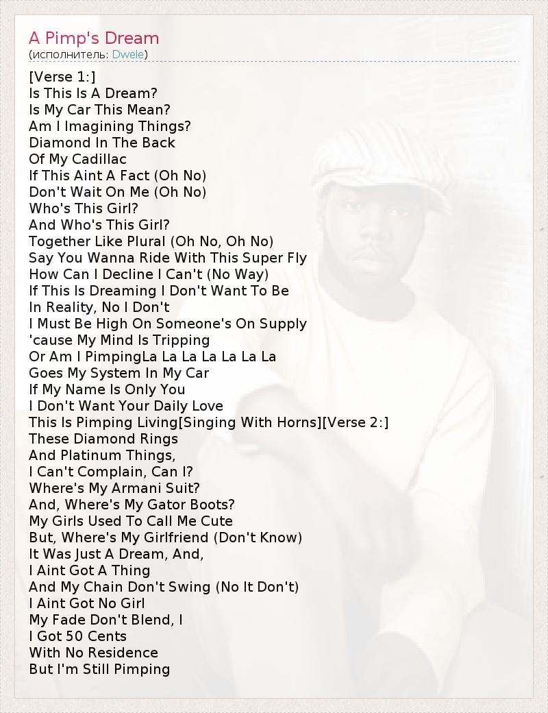 [Verse 1:] Is This Is A Dream? Is My Car This Mean? Am I Imagining Things? Diamond In The Back Of My Cadillac If This Aint A Fact (Oh No) Don't Wait On Me (Oh No) Who's This Girl? And Who's This Girl? Together Like Plural (Oh No, Oh No) Say You Wanna Ride With This Super Fly How Can I Decline I Can't (No Way) If This Is Dreaming I Don't Want To Be In Reality, No I Don't I Must Be High On Someone's On Supply 'cause My Mind Is Tripping Or Am I PimpingLa La La La La La La Goes My System In My Car If My Name Is Only You I Don't Want Your Daily Love This Is Pimping Living[Singing With Horns][Verse 2:] These Diamond Rings And Platinum Things, I Can't Complain, Can I? Where's My Armani Suit? And, Where's My Gator Boots? My Girls Used To Call Me Cute But, Where's My Girlfriend (Don't Know) It Was Just A Dream, And, I Aint Got A Thing And My Chain Don't Swing (No It Don't) I Aint Got No Girl My Fade Don't Blend, I I Got 50 Cents With No Residence But I'm Still Pimping