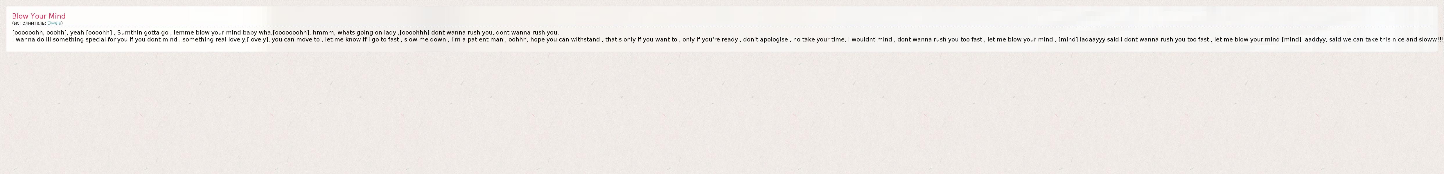 i wanna do lil something special for you if you dont mind , something real lovely,[lovely], you can move to , let me know if i go to fast , slow me down , i'm a patient man , oohhh, hope you can withstand , that's only if you want to , only if you're ready , don't apologise , no take your time, i wouldnt mind , dont wanna rush you too fast , let me blow your mind , [mind] ladaayyy said i dont wanna rush you too fast , let me blow your mind [mind] laaddyy, said we can take this nice and sloww!!!
