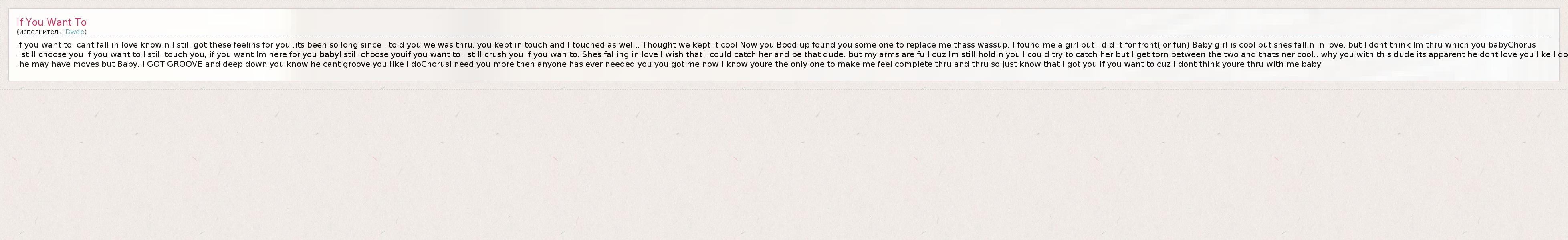If you want toI cant fall in love knowin I still got these feelins for you .its been so long since I told you we was thru. you kept in touch and I touched as well.. Thought we kept it cool Now you Bood up found you some one to replace me thass wassup. I found me a girl but I did it for front( or fun) Baby girl is cool but shes fallin in love. but I dont think Im thru which you babyChorus