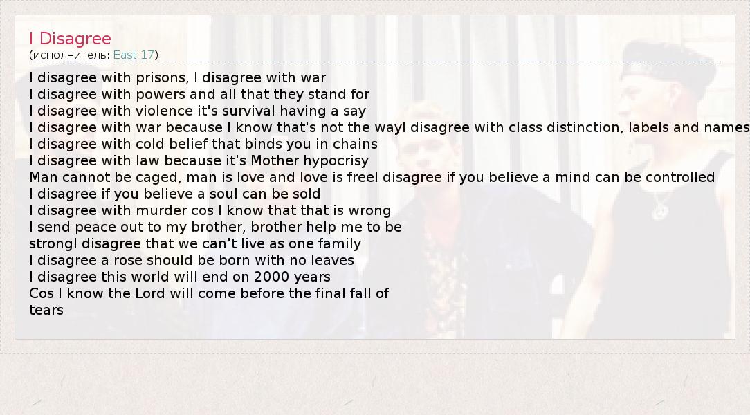 Это интересно:Основана 1 апреля 1992 г. Место основания – Лондон. Не существует с лета 1998 г. Энтони Мортимер готовит собственный альбом. Остальные участники составляют группу E-17.Все четверо участников будущей группы проживали в Walthamstow - небольшом городке, расположенном в северо-восточной части Лондона. Brian Harvey, Terry Coldwell, Anthony Mortimer и John Hendy посещали тогда школу St. George Monoux. Первыми познакомились Anthony... продолжение