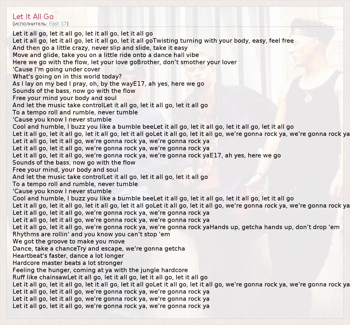 Let it all go, let it all go, let it all go, let it all go Let it all go, let it all go, let it all go, let it all goTwisting turning with your body, easy, feel free And then go a little crazy, never slip and slide, take it easy Move and glide, take you on a little ride onto a dance hall vibe Here we go with the flow, let your love goBrother, don't smother your lover 'Cause I'm going under cover What's going on in this world today? As I lay on my bed I pray, oh, by the wayE17, ah yes, here we go Sounds of the bass, now go with the flow Free your mind your body and soul And let the music take controlLet it all go, let it all go, let it all go To a tempo roll and rumble, never tumble 'Cause you know I never stumble Cool and humble, I buzz you like a bumble beeLet it all go, let it all go, let it all go, let it all go Let it all go, let it all go, let it all go, let it all goLet it all go, let it all go, we're gonna rock ya, we're gonna rock ya Let it all go, let it all go, we're gonna rock ya, we're gonna rock ya Let it all go, let it all go, we're gonna rock ya, we're gonna rock ya Let it all go, let it all go, we're gonna rock ya, we're gonna rock yaE17, ah yes, here we go Sounds of the bass, now go with the flow Free your mind, your body and soul And let the music take controlLet it all go, let it all go, let it all go To a tempo roll and rumble, never tumble 'Cause you know I never stumble Cool and humble, I buzz you like a bumble beeLet it all go, let it all go, let it all go, let it all go Let it all go, let it all go, let it all go, let it all goLet it all go, let it all go, we're gonna rock ya, we're gonna rock ya Let it all go, let it all go, we're gonna rock ya, we're gonna rock ya Let it all go, let it all go, we're gonna rock ya, we're gonna rock ya Let it all go, let it all go, we're gonna rock ya, we're gonna rock yaHands up, getcha hands up, don't drop 'em Rhythms are rollin' and you know you can't stop 'em We got the groove to make you move Dance, take a chanceTry and escape, we're gonna getcha Heartbeat's faster, dance a lot longer Hardcore master beats a lot stronger Feeling the hunger, coming at ya with the jungle hardcore Ruff like chainsawLet it all go, let it all go, let it all go, let it all go Let it all go, let it all go, let it all go, let it all goLet it all go, let it all go, we're gonna rock ya, we're gonna rock ya Let it all go, let it all go, we're gonna rock ya, we're gonna rock ya Let it all go, let it all go, we're gonna rock ya, we're gonna rock ya Let it all go, let it all go, we're gonna rock ya, we're gonna rock ya