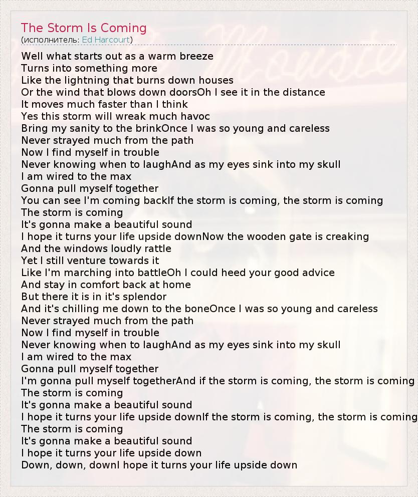 Well what starts out as a warm breeze Turns into something more Like the lightning that burns down houses Or the wind that blows down doorsOh I see it in the distance It moves much faster than I think Yes this storm will wreak much havoc Bring my sanity to the brinkOnce I was so young and careless Never strayed much from the path Now I find myself in trouble Never knowing when to laughAnd as my eyes sink into my skull I am wired to the max Gonna pull myself together You can see I'm coming backIf the storm is coming, the storm is coming The storm is coming It's gonna make a beautiful sound I hope it turns your life upside downNow the wooden gate is creaking And the windows loudly rattle Yet I still venture towards it Like I'm marching into battleOh I could heed your good advice And stay in comfort back at home But there it is in it's splendor And it's chilling me down to the boneOnce I was so young and careless Never strayed much from the path Now I find myself in trouble Never knowing when to laughAnd as my eyes sink into my skull I am wired to the max Gonna pull myself together I'm gonna pull myself togetherAnd if the storm is coming, the storm is coming The storm is coming It's gonna make a beautiful sound I hope it turns your life upside downIf the storm is coming, the storm is coming The storm is coming It's gonna make a beautiful sound I hope it turns your life upside down Down, down, downI hope it turns your life upside down
