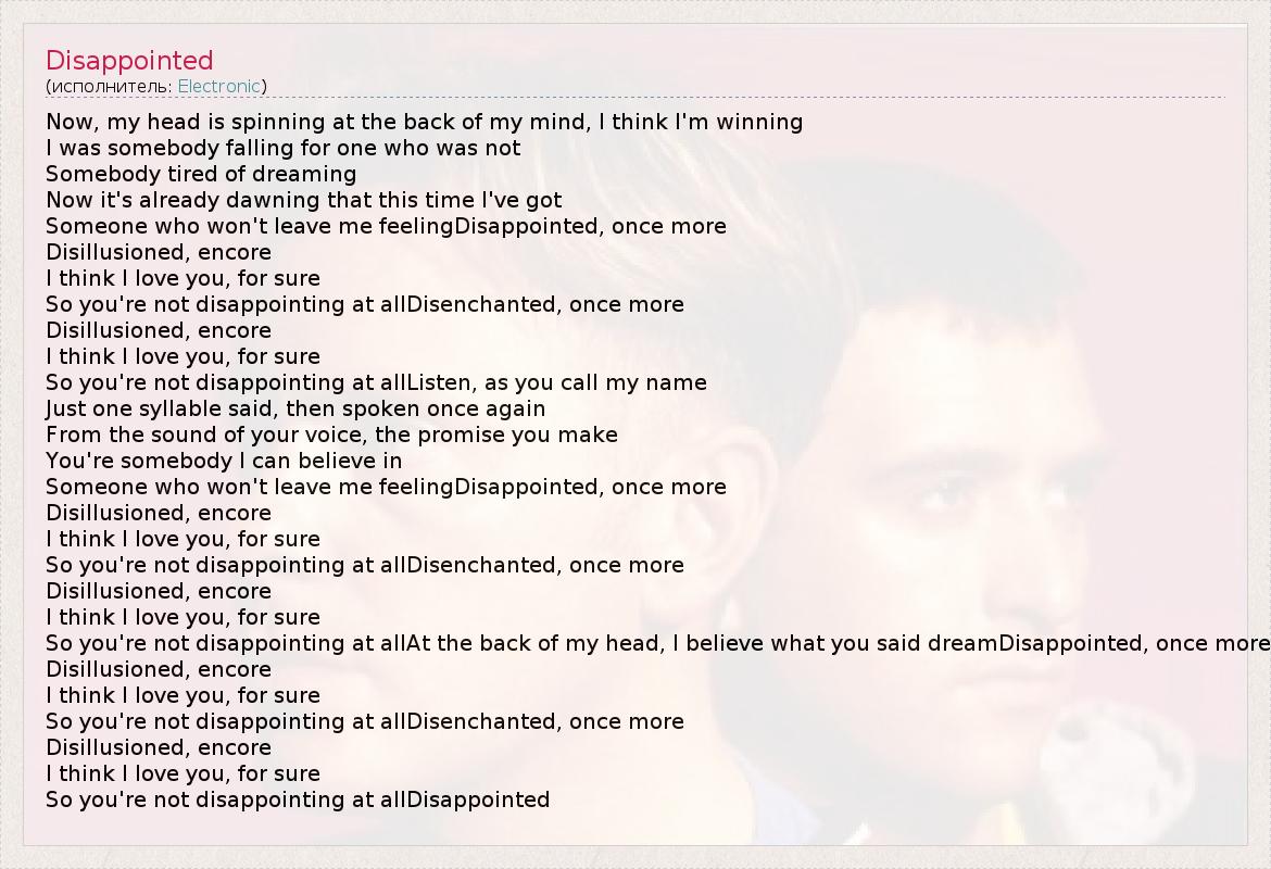 Now, my head is spinning at the back of my mind, I think I'm winning I was somebody falling for one who was not Somebody tired of dreaming Now it's already dawning that this time I've got Someone who won't leave me feelingDisappointed, once more Disillusioned, encore I think I love you, for sure So you're not disappointing at allDisenchanted, once more Disillusioned, encore I think I love you, for sure So you're not disappointing at allListen, as you call my name Just one syllable said, then spoken once again From the sound of your voice, the promise you make You're somebody I can believe in Someone who won't leave me feelingDisappointed, once more Disillusioned, encore I think I love you, for sure So you're not disappointing at allDisenchanted, once more Disillusioned, encore I think I love you, for sure So you're not disappointing at allAt the back of my head, I believe what you said dreamDisappointed, once more Disillusioned, encore I think I love you, for sure So you're not disappointing at allDisenchanted, once more Disillusioned, encore I think I love you, for sure So you're not disappointing at allDisappointed