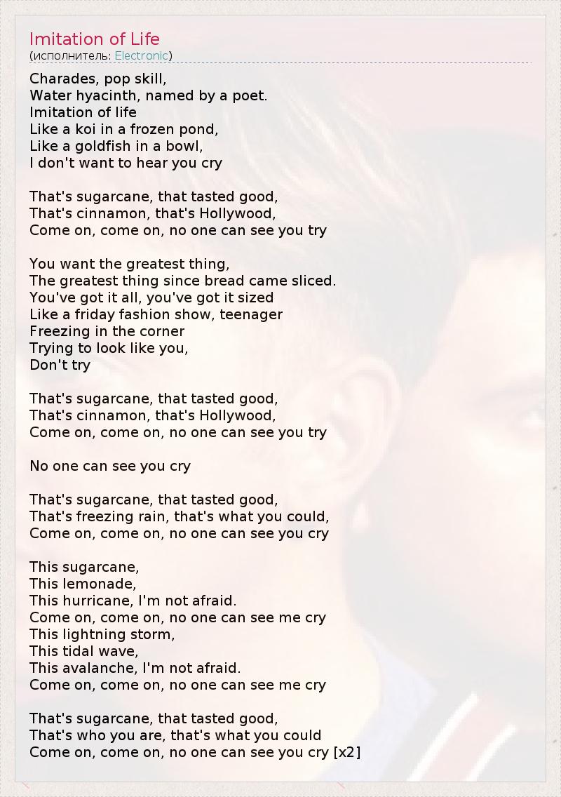 Charades, pop skill, Water hyacinth, named by a poet. Imitation of life Like a koi in a frozen pond, Like a goldfish in a bowl, I don't want to hear you cry That's sugarcane, that tasted good, That's cinnamon, that's Hollywood, Come on, come on, no one can see you try You want the greatest thing, The greatest thing since bread came sliced. You've got it all, you've got it sized Like a friday fashion show, teenager Freezing in the corner Trying to look like you, Don't try That's sugarcane, that tasted good, That's cinnamon, that's Hollywood, Come on, come on, no one can see you try No one can see you cry That's sugarcane, that tasted good, That's freezing rain, that's what you could, Come on, come on, no one can see you cry This sugarcane, This lemonade, This hurricane, I'm not afraid. Come on, come on, no one can see me cry This lightning storm, This tidal wave, This avalanche, I'm not afraid. Come on, come on, no one can see me cry That's sugarcane, that tasted good, That's who you are, that's what you could Come on, come on, no one can see you cry [x2]