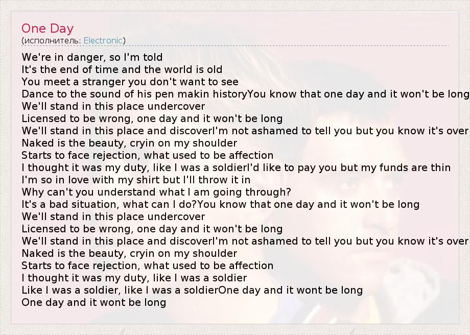 We're in danger, so I'm told It's the end of time and the world is old You meet a stranger you don't want to see Dance to the sound of his pen makin historyYou know that one day and it won't be long We'll stand in this place undercover Licensed to be wrong, one day and it won't be long We'll stand in this place and discoverI'm not ashamed to tell you but you know it's over Naked is the beauty, cryin on my shoulder Starts to face rejection, what used to be affection I thought it was my duty, like I was a soldierI'd like to pay you but my funds are thin I'm so in love with my shirt but I'll throw it in Why can't you understand what I am going through? It's a bad situation, what can I do?You know that one day and it won't be long We'll stand in this place undercover Licensed to be wrong, one day and it won't be long We'll stand in this place and discoverI'm not ashamed to tell you but you know it's over Naked is the beauty, cryin on my shoulder Starts to face rejection, what used to be affection I thought it was my duty, like I was a soldier Like I was a soldier, like I was a soldierOne day and it wont be long One day and it wont be long