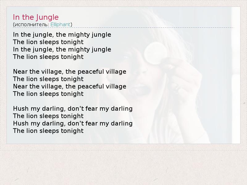 In the jungle, the mighty jungle The lion sleeps tonight In the jungle, the mighty jungle The lion sleeps tonight Near the village, the peaceful village The lion sleeps tonight Near the village, the peaceful village The lion sleeps tonight Hush my darling, don't fear my darling The lion sleeps tonight Hush my darling, don't fear my darling The lion sleeps tonight