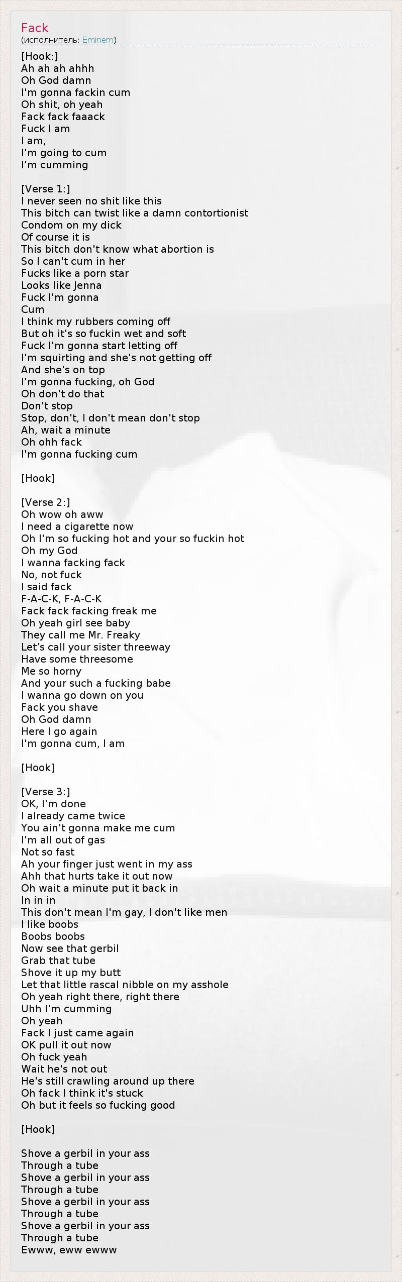 [Hook:] Ah ah ah ahhh Oh God damn I'm gonna fackin cum Oh shit, oh yeah Fack fack faaack Fuck I am I am, I'm going to cum I'm cumming [Verse 1:] I never seen no shit like this This bitch can twist like a damn contortionist Condom on my dick Of course it is This bitch don't know what abortion is So I can't cum in her Fucks like a porn star Looks like Jenna Fuck I'm gonna Cum I think my rubbers coming off But oh it's so fuckin wet and soft Fuck I'm gonna start letting off I'm squirting and she's not getting off And she's on top I'm gonna fucking, oh God Oh don't do that Don't stop Stop, don't, I don't mean don't stop Ah, wait a minute Oh ohh fack I'm gonna fucking cum [Hook] [Verse 2:] Oh wow oh aww I need a cigarette now Oh I'm so fucking hot and your so fuckin hot Oh my God I wanna facking fack No, not fuck I said fack F-A-C-K, F-A-C-K Fack fack facking freak me Oh yeah girl see baby They call me Mr. Freaky Let’s call your sister threeway Have some threesome Me so horny And your such a fucking babe I wanna go down on you Fack you shave Oh God damn Here I go again I'm gonna cum, I am [Hook] [Verse 3:] OK, I'm done I already came twice You ain't gonna make me cum I'm all out of gas Not so fast Ah your finger just went in my ass Ahh that hurts take it out now Oh wait a minute put it back in In in in This don't mean I'm gay, I don't like men I like boobs Boobs boobs Now see that gerbil Grab that tube Shove it up my butt Let that little rascal nibble on my asshole Oh yeah right there, right there Uhh I'm cumming Oh yeah Fack I just came again OK pull it out now Oh fuck yeah Wait he's not out He's still crawling around up there Oh fack I think it's stuck Oh but it feels so fucking good [Hook] Shove a gerbil in your ass Through a tube Shove a gerbil in your ass Through a tube Shove a gerbil in your ass Through a tube Shove a gerbil in your ass Through a tube Ewww, eww ewww