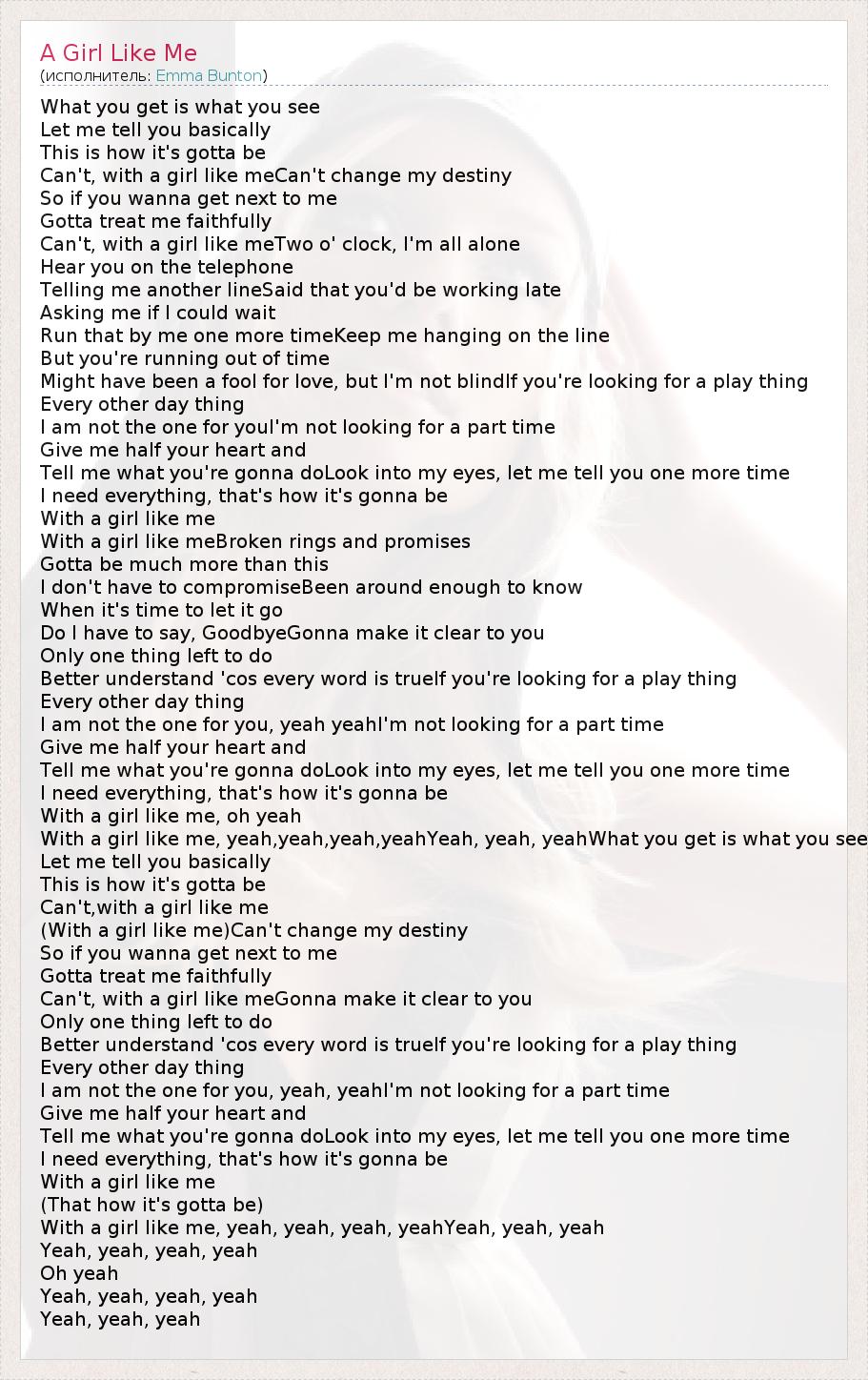 With a girl like me, yeah,yeah,yeah,yeahYeah, yeah, yeahWhat you get is what you see