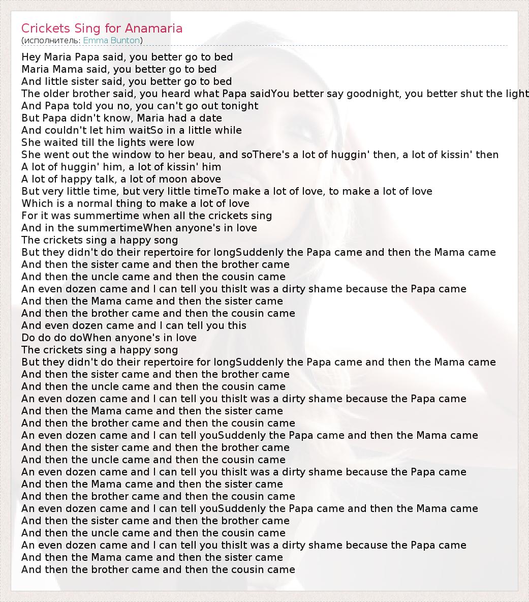 Hey Maria Papa said, you better go to bed Maria Mama said, you better go to bed And little sister said, you better go to bed The older brother said, you heard what Papa saidYou better say goodnight, you better shut the light And Papa told you no, you can't go out tonight But Papa didn't know, Maria had a date And couldn't let him waitSo in a little while She waited till the lights were low She went out the window to her beau, and soThere's a lot of huggin' then, a lot of kissin' then A lot of huggin' him, a lot of kissin' him A lot of happy talk, a lot of moon above But very little time, but very little timeTo make a lot of love, to make a lot of love Which is a normal thing to make a lot of love For it was summertime when all the crickets sing And in the summertimeWhen anyone's in love The crickets sing a happy song But they didn't do their repertoire for longSuddenly the Papa came and then the Mama came And then the sister came and then the brother came And then the uncle came and then the cousin came An even dozen came and I can tell you thisIt was a dirty shame because the Papa came And then the Mama came and then the sister came And then the brother came and then the cousin came And even dozen came and I can tell you this Do do do doWhen anyone's in love The crickets sing a happy song But they didn't do their repertoire for longSuddenly the Papa came and then the Mama came And then the sister came and then the brother came And then the uncle came and then the cousin came An even dozen came and I can tell you thisIt was a dirty shame because the Papa came And then the Mama came and then the sister came And then the brother came and then the cousin came An even dozen came and I can tell youSuddenly the Papa came and then the Mama came And then the sister came and then the brother came And then the uncle came and then the cousin came An even dozen came and I can tell you thisIt was a dirty shame because the Papa came And then the Mama came and then the sister came And then the brother came and then the cousin came An even dozen came and I can tell youSuddenly the Papa came and then the Mama came And then the sister came and then the brother came And then the uncle came and then the cousin came An even dozen came and I can tell you thisIt was a dirty shame because the Papa came And then the Mama came and then the sister came And then the brother came and then the cousin came