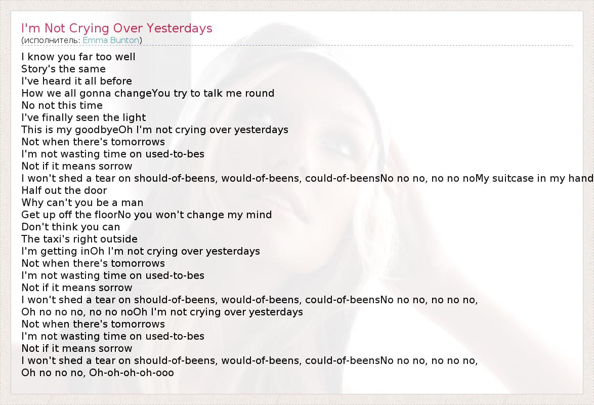 I know you far too well Story's the same I've heard it all before How we all gonna changeYou try to talk me round No not this time I've finally seen the light This is my goodbyeOh I'm not crying over yesterdays Not when there's tomorrows I'm not wasting time on used-to-bes Not if it means sorrow I won't shed a tear on should-of-beens, would-of-beens, could-of-beensNo no no, no no noMy suitcase in my hand Half out the door Why can't you be a man Get up off the floorNo you won't change my mind Don't think you can The taxi's right outside I'm getting inOh I'm not crying over yesterdays Not when there's tomorrows I'm not wasting time on used-to-bes Not if it means sorrow I won't shed a tear on should-of-beens, would-of-beens, could-of-beensNo no no, no no no, Oh no no no, no no noOh I'm not crying over yesterdays Not when there's tomorrows I'm not wasting time on used-to-bes Not if it means sorrow I won't shed a tear on should-of-beens, would-of-beens, could-of-beensNo no no, no no no, Oh no no no, Oh-oh-oh-oh-ooo