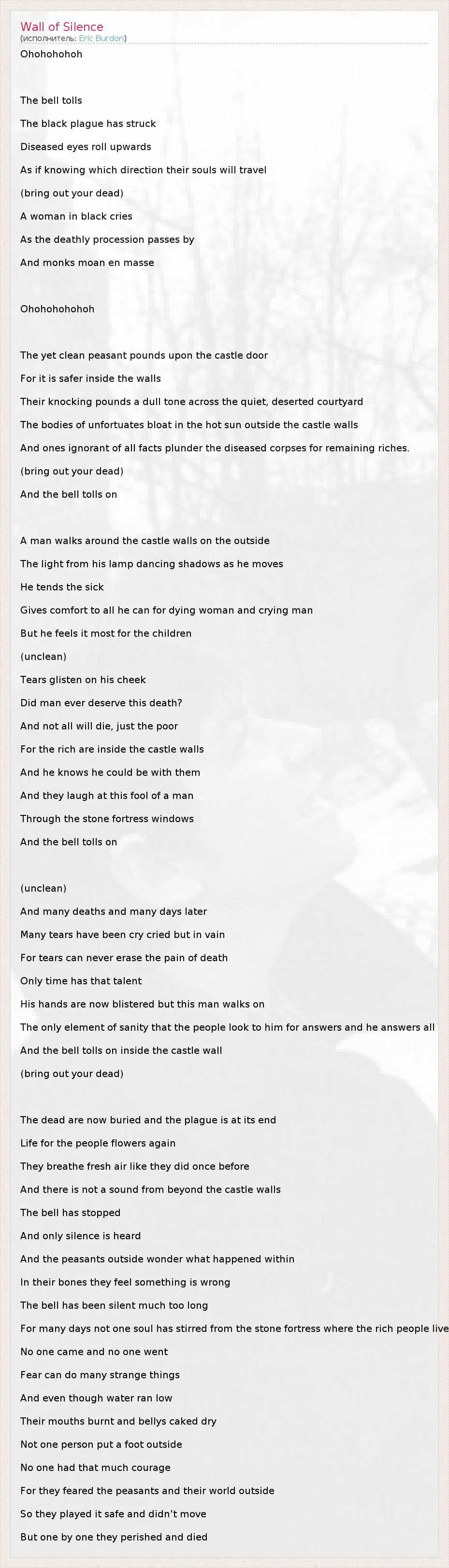 Ohohohohoh The bell tolls The black plague has struck Diseased eyes roll upwards As if knowing which direction their souls will travel (bring out your dead) A woman in black cries As the deathly procession passes by And monks moan en masse Ohohohohohoh The yet clean peasant pounds upon the castle door For it is safer inside the walls Their knocking pounds a dull tone across the quiet, deserted courtyard The bodies of unfortuates bloat in the hot sun outside the castle walls And ones ignorant of all facts plunder the diseased corpses for remaining riches. (bring out your dead) And the bell tolls on A man walks around the castle walls on the outside The light from his lamp dancing shadows as he moves He tends the sick Gives comfort to all he can for dying woman and crying man But he feels it most for the children (unclean) Tears glisten on his cheek Did man ever deserve this death? And not all will die, just the poor For the rich are inside the castle walls And he knows he could be with them And they laugh at this fool of a man Through the stone fortress windows And the bell tolls on (unclean) And many deaths and many days later Many tears have been cry cried but in vain For tears can never erase the pain of death Only time has that talent His hands are now blistered but this man walks on The only element of sanity that the people look to him for answers and he answers all And the bell tolls on inside the castle wall (bring out your dead) The dead are now buried and the plague is at its end Life for the people flowers again They breathe fresh air like they did once before And there is not a sound from beyond the castle walls The bell has stopped And only silence is heard And the peasants outside wonder what happened within In their bones they feel something is wrong The bell has been silent much too long For many days not one soul has stirred from the stone fortress where the rich people live No one came and no one went Fear can do many strange things And even though water ran low Their mouths burnt and bellys caked dry Not one person put a foot outside No one had that much courage For they feared the peasants and their world outside So they played it safe and didn't move But one by one they perished and died