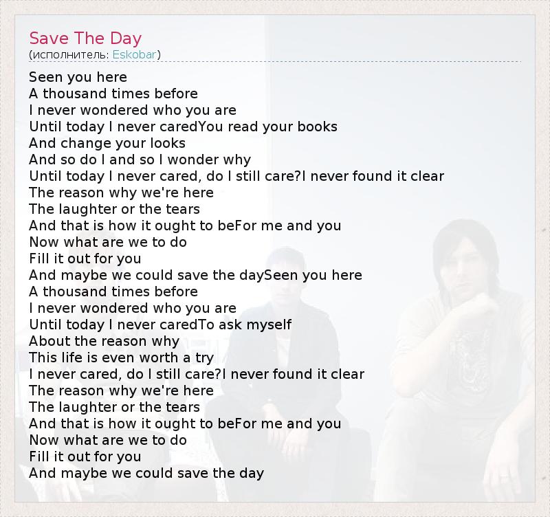 Seen you here A thousand times before I never wondered who you are Until today I never caredYou read your books And change your looks And so do I and so I wonder why Until today I never cared, do I still care?I never found it clear The reason why we're here The laughter or the tears And that is how it ought to beFor me and you Now what are we to do Fill it out for you And maybe we could save the daySeen you here A thousand times before I never wondered who you are Until today I never caredTo ask myself About the reason why This life is even worth a try I never cared, do I still care?I never found it clear The reason why we're here The laughter or the tears And that is how it ought to beFor me and you Now what are we to do Fill it out for you And maybe we could save the day