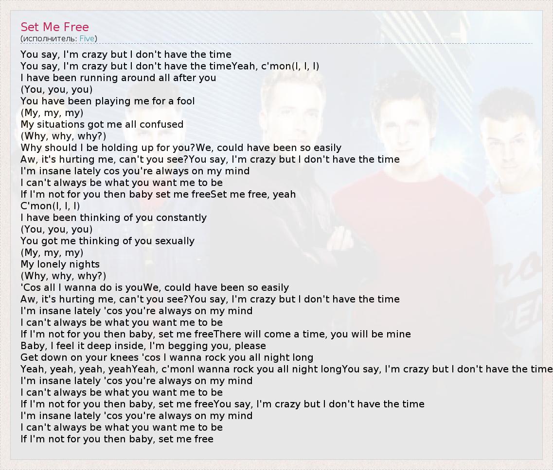 You say, I'm crazy but I don't have the time You say, I'm crazy but I don't have the timeYeah, c'mon(I, I, I) I have been running around all after you (You, you, you) You have been playing me for a fool (My, my, my) My situations got me all confused (Why, why, why?) Why should I be holding up for you?We, could have been so easily Aw, it's hurting me, can't you see?You say, I'm crazy but I don't have the time I'm insane lately cos you're always on my mind I can't always be what you want me to be If I'm not for you then baby set me freeSet me free, yeah C'mon(I, I, I) I have been thinking of you constantly (You, you, you) You got me thinking of you sexually (My, my, my) My lonely nights (Why, why, why?) 'Cos all I wanna do is youWe, could have been so easily Aw, it's hurting me, can't you see?You say, I'm crazy but I don't have the time I'm insane lately 'cos you're always on my mind I can't always be what you want me to be If I'm not for you then baby, set me freeThere will come a time, you will be mine Baby, I feel it deep inside, I'm begging you, please Get down on your knees 'cos I wanna rock you all night long Yeah, yeah, yeah, yeahYeah, c'monI wanna rock you all night longYou say, I'm crazy but I don't have the time I'm insane lately 'cos you're always on my mind I can't always be what you want me to be If I'm not for you then baby, set me freeYou say, I'm crazy but I don't have the time I'm insane lately 'cos you're always on my mind I can't always be what you want me to be If I'm not for you then baby, set me free