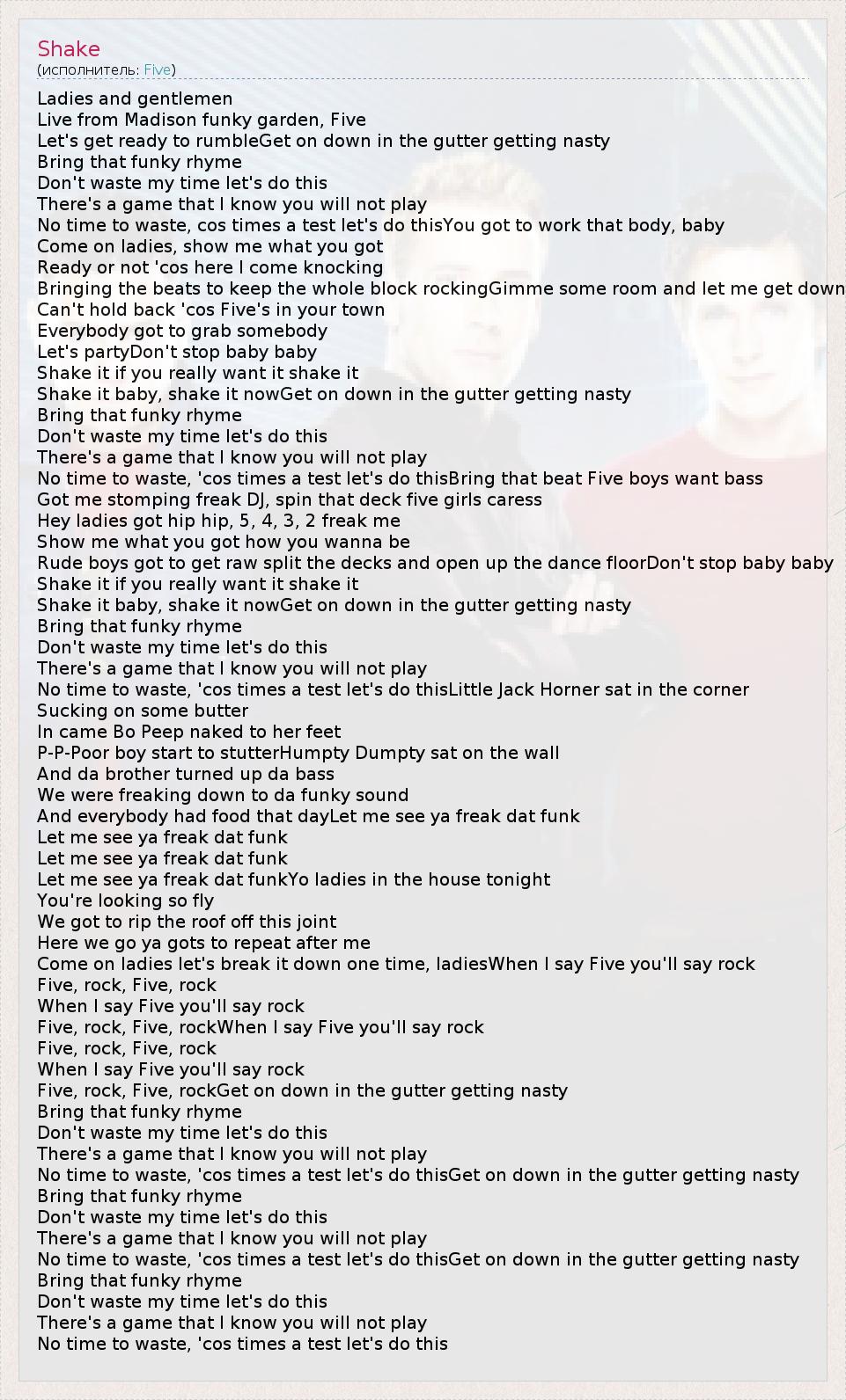 Ladies and gentlemen Live from Madison funky garden, Five Let's get ready to rumbleGet on down in the gutter getting nasty Bring that funky rhyme Don't waste my time let's do this There's a game that I know you will not play No time to waste, cos times a test let's do thisYou got to work that body, baby Come on ladies, show me what you got Ready or not 'cos here I come knocking Bringing the beats to keep the whole block rockingGimme some room and let me get down Can't hold back 'cos Five's in your town Everybody got to grab somebody Let's partyDon't stop baby baby Shake it if you really want it shake it Shake it baby, shake it nowGet on down in the gutter getting nasty Bring that funky rhyme Don't waste my time let's do this There's a game that I know you will not play No time to waste, 'cos times a test let's do thisBring that beat Five boys want bass Got me stomping freak DJ, spin that deck five girls caress Hey ladies got hip hip, 5, 4, 3, 2 freak me Show me what you got how you wanna be Rude boys got to get raw split the decks and open up the dance floorDon't stop baby baby Shake it if you really want it shake it Shake it baby, shake it nowGet on down in the gutter getting nasty Bring that funky rhyme Don't waste my time let's do this There's a game that I know you will not play No time to waste, 'cos times a test let's do thisLittle Jack Horner sat in the corner Sucking on some butter In came Bo Peep naked to her feet P-P-Poor boy start to stutterHumpty Dumpty sat on the wall And da brother turned up da bass We were freaking down to da funky sound And everybody had food that dayLet me see ya freak dat funk Let me see ya freak dat funk Let me see ya freak dat funk Let me see ya freak dat funkYo ladies in the house tonight You're looking so fly We got to rip the roof off this joint Here we go ya gots to repeat after me Come on ladies let's break it down one time, ladiesWhen I say Five you'll say rock Five, rock, Five, rock When I say Five you'll say rock Five, rock, Five, rockWhen I say Five you'll say rock Five, rock, Five, rock When I say Five you'll say rock Five, rock, Five, rockGet on down in the gutter getting nasty Bring that funky rhyme Don't waste my time let's do this There's a game that I know you will not play No time to waste, 'cos times a test let's do thisGet on down in the gutter getting nasty Bring that funky rhyme Don't waste my time let's do this There's a game that I know you will not play No time to waste, 'cos times a test let's do thisGet on down in the gutter getting nasty Bring that funky rhyme Don't waste my time let's do this There's a game that I know you will not play No time to waste, 'cos times a test let's do this
