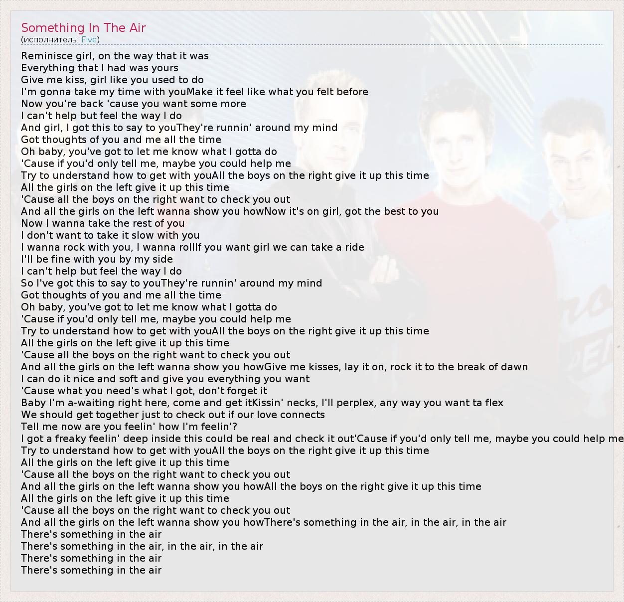 Reminisce girl, on the way that it was Everything that I had was yours Give me kiss, girl like you used to do I'm gonna take my time with youMake it feel like what you felt before Now you're back 'cause you want some more I can't help but feel the way I do And girl, I got this to say to youThey're runnin' around my mind Got thoughts of you and me all the time Oh baby, you've got to let me know what I gotta do 'Cause if you'd only tell me, maybe you could help me Try to understand how to get with youAll the boys on the right give it up this time All the girls on the left give it up this time 'Cause all the boys on the right want to check you out And all the girls on the left wanna show you howNow it's on girl, got the best to you Now I wanna take the rest of you I don't want to take it slow with you I wanna rock with you, I wanna rollIf you want girl we can take a ride I'll be fine with you by my side I can't help but feel the way I do So I've got this to say to youThey're runnin' around my mind Got thoughts of you and me all the time Oh baby, you've got to let me know what I gotta do 'Cause if you'd only tell me, maybe you could help me Try to understand how to get with youAll the boys on the right give it up this time All the girls on the left give it up this time 'Cause all the boys on the right want to check you out And all the girls on the left wanna show you howGive me kisses, lay it on, rock it to the break of dawn I can do it nice and soft and give you everything you want 'Cause what you need's what I got, don't forget it Baby I'm a-waiting right here, come and get itKissin' necks, I'll perplex, any way you want ta flex We should get together just to check out if our love connects Tell me now are you feelin' how I'm feelin'? I got a freaky feelin' deep inside this could be real and check it out'Cause if you'd only tell me, maybe you could help me Try to understand how to get with youAll the boys on the right give it up this time All the girls on the left give it up this time 'Cause all the boys on the right want to check you out And all the girls on the left wanna show you howAll the boys on the right give it up this time All the girls on the left give it up this time 'Cause all the boys on the right want to check you out And all the girls on the left wanna show you howThere's something in the air, in the air, in the air There's something in the air There's something in the air, in the air, in the air There's something in the air There's something in the air