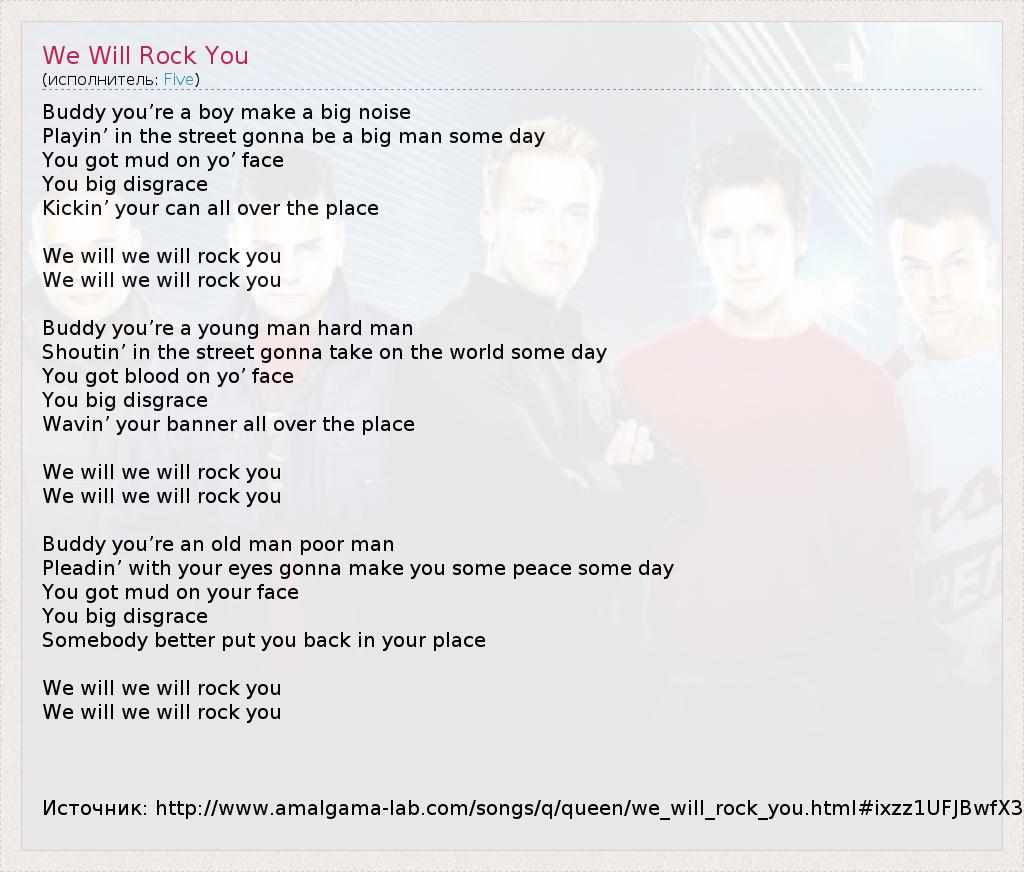 Источник: http://www.amalgama-lab.com/songs/q/queen/we_will_rock_you.html#ixzz1UFJBwfX3