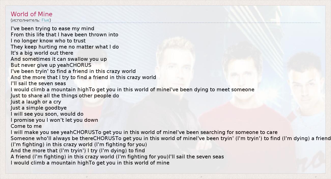 Someone who'll always be thereCHORUSTo get you in this world of mineI've been tryin' (I'm tryin') to find (I'm dying) a friend