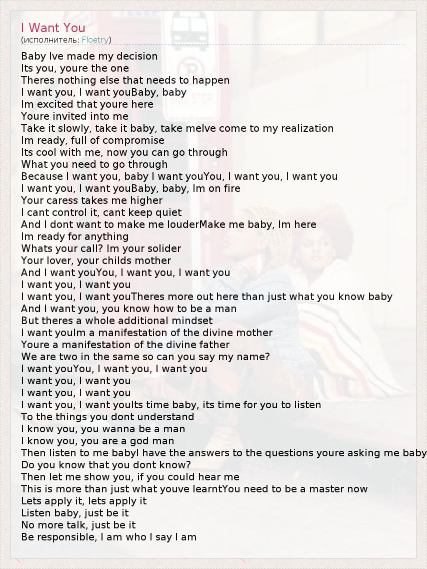 Baby Ive made my decision Its you, youre the one Theres nothing else that needs to happen I want you, I want youBaby, baby Im excited that youre here Youre invited into me Take it slowly, take it baby, take meIve come to my realization Im ready, full of compromise Its cool with me, now you can go through What you need to go through Because I want you, baby I want youYou, I want you, I want you I want you, I want youBaby, baby, Im on fire Your caress takes me higher I cant control it, cant keep quiet And I dont want to make me louderMake me baby, Im here Im ready for anything Whats your call? Im your solider Your lover, your childs mother And I want youYou, I want you, I want you I want you, I want you I want you, I want youTheres more out here than just what you know baby And I want you, you know how to be a man But theres a whole additional mindset I want youIm a manifestation of the divine mother Youre a manifestation of the divine father We are two in the same so can you say my name? I want youYou, I want you, I want you I want you, I want you I want you, I want you I want you, I want youIts time baby, its time for you to listen To the things you dont understand I know you, you wanna be a man I know you, you are a god man Then listen to me babyI have the answers to the questions youre asking me baby Do you know that you dont know? Then let me show you, if you could hear me This is more than just what youve learntYou need to be a master now Lets apply it, lets apply it Listen baby, just be it No more talk, just be it Be responsible, I am who I say I am