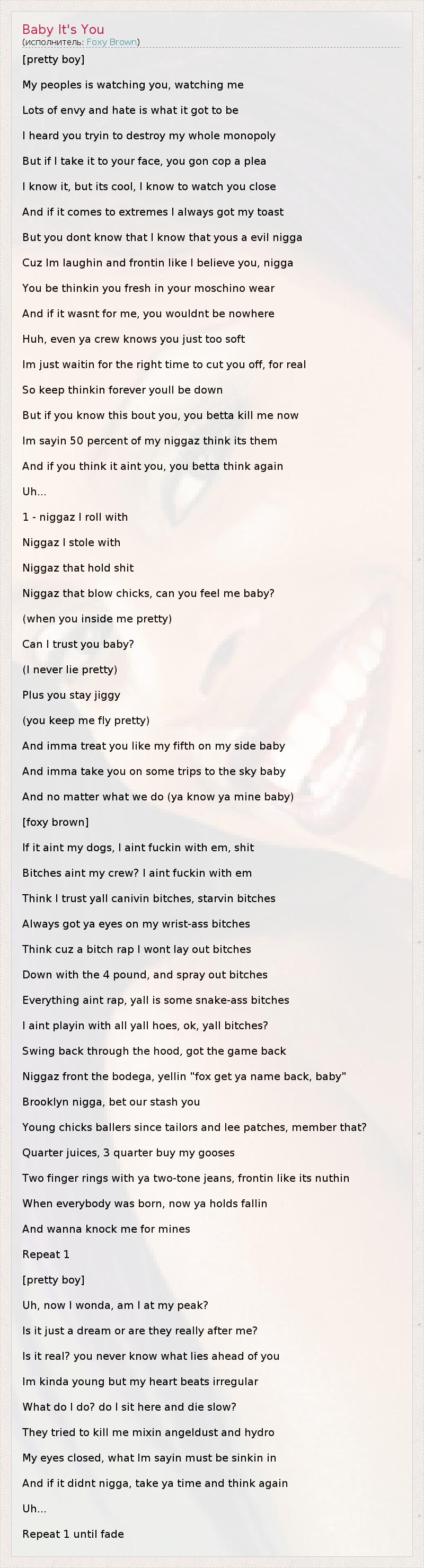 [pretty boy] My peoples is watching you, watching me Lots of envy and hate is what it got to be I heard you tryin to destroy my whole monopoly But if I take it to your face, you gon cop a plea I know it, but its cool, I know to watch you close And if it comes to extremes I always got my toast But you dont know that I know that yous a evil nigga Cuz Im laughin and frontin like I believe you, nigga You be thinkin you fresh in your moschino wear And if it wasnt for me, you wouldnt be nowhere Huh, even ya crew knows you just too soft Im just waitin for the right time to cut you off, for real So keep thinkin forever youll be down But if you know this bout you, you betta kill me now Im sayin 50 percent of my niggaz think its them And if you think it aint you, you betta think again Uh... 1 - niggaz I roll with Niggaz I stole with Niggaz that hold shit Niggaz that blow chicks, can you feel me baby? (when you inside me pretty) Can I trust you baby? (I never lie pretty) Plus you stay jiggy (you keep me fly pretty) And imma treat you like my fifth on my side baby And imma take you on some trips to the sky baby And no matter what we do (ya know ya mine baby) [foxy brown] If it aint my dogs, I aint fuckin with em, shit Bitches aint my crew? I aint fuckin with em Think I trust yall canivin bitches, starvin bitches Always got ya eyes on my wrist-ass bitches Think cuz a bitch rap I wont lay out bitches Down with the 4 pound, and spray out bitches Everything aint rap, yall is some snake-ass bitches I aint playin with all yall hoes, ok, yall bitches? Swing back through the hood, got the game back Niggaz front the bodega, yellin "fox get ya name back, baby" Brooklyn nigga, bet our stash you Young chicks ballers since tailors and lee patches, member that? Quarter juices, 3 quarter buy my gooses Two finger rings with ya two-tone jeans, frontin like its nuthin When everybody was born, now ya holds fallin And wanna knock me for mines Repeat 1 [pretty boy] Uh, now I wonda, am I at my peak? Is it just a dream or are they really after me? Is it real? you never know what lies ahead of you Im kinda young but my heart beats irregular What do I do? do I sit here and die slow? They tried to kill me mixin angeldust and hydro My eyes closed, what Im sayin must be sinkin in And if it didnt nigga, take ya time and think again Uh... Repeat 1 until fade