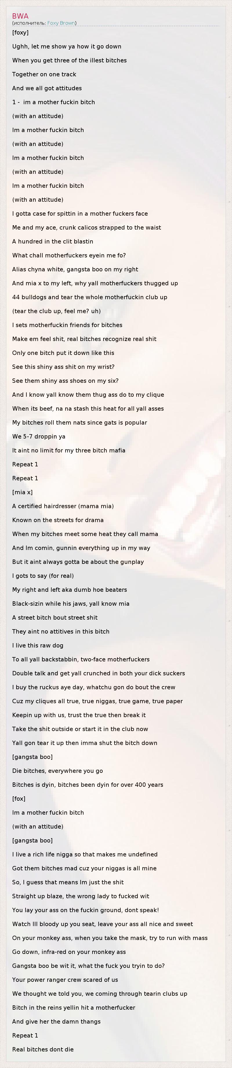 [foxy] Ughh, let me show ya how it go down When you get three of the illest bitches Together on one track And we all got attitudes 1 - im a mother fuckin bitch (with an attitude) Im a mother fuckin bitch (with an attitude) Im a mother fuckin bitch (with an attitude) Im a mother fuckin bitch (with an attitude) I gotta case for spittin in a mother fuckers face Me and my ace, crunk calicos strapped to the waist A hundred in the clit blastin What chall motherfuckers eyein me fo? Alias chyna white, gangsta boo on my right And mia x to my left, why yall motherfuckers thugged up 44 bulldogs and tear the whole motherfuckin club up (tear the club up, feel me? uh) I sets motherfuckin friends for bitches Make em feel shit, real bitches recognize real shit Only one bitch put it down like this See this shiny ass shit on my wrist? See them shiny ass shoes on my six? And I know yall know them thug ass do to my clique When its beef, na na stash this heat for all yall asses My bitches roll them nats since gats is popular We 5-7 droppin ya It aint no limit for my three bitch mafia Repeat 1 Repeat 1 [mia x] A certified hairdresser (mama mia) Known on the streets for drama When my bitches meet some heat they call mama And Im comin, gunnin everything up in my way But it aint always gotta be about the gunplay I gots to say (for real) My right and left aka dumb hoe beaters Black-sizin while his jaws, yall know mia A street bitch bout street shit They aint no attitives in this bitch I live this raw dog To all yall backstabbin, two-face motherfuckers Double talk and get yall crunched in both your dick suckers I buy the ruckus aye day, whatchu gon do bout the crew Cuz my cliques all true, true niggas, true game, true paper Keepin up with us, trust the true then break it Take the shit outside or start it in the club now Yall gon tear it up then imma shut the bitch down [gangsta boo] Die bitches, everywhere you go Bitches is dyin, bitches been dyin for over 400 years [fox] Im a mother fuckin bitch (with an attitude) [gangsta boo] I live a rich life nigga so that makes me undefined Got them bitches mad cuz your niggas is all mine So, I guess that means Im just the shit Straight up blaze, the wrong lady to fucked wit You lay your ass on the fuckin ground, dont speak! Watch Ill bloody up you seat, leave your ass all nice and sweet On your monkey ass, when you take the mask, try to run with mass Go down, infra-red on your monkey ass Gangsta boo be wit it, what the fuck you tryin to do? Your power ranger crew scared of us We thought we told you, we coming through tearin clubs up Bitch in the reins yellin hit a motherfucker And give her the damn thangs Repeat 1 Real bitches dont die