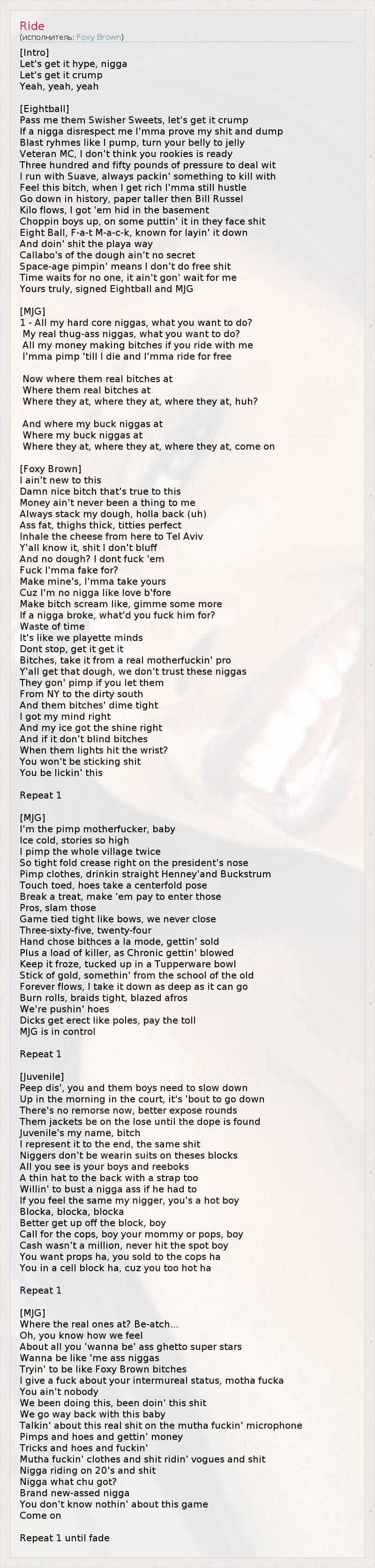 [Intro] Let's get it hype, nigga Let's get it crump Yeah, yeah, yeah [Eightball] Pass me them Swisher Sweets, let's get it crump If a nigga disrespect me I'mma prove my shit and dump Blast ryhmes like I pump, turn your belly to jelly Veteran MC, I don't think you rookies is ready Three hundred and fifty pounds of pressure to deal wit I run with Suave, always packin' something to kill with Feel this bitch, when I get rich I'mma still hustle Go down in history, paper taller then Bill Russel Kilo flows, I got 'em hid in the basement Choppin boys up, on some puttin' it in they face shit Eight Ball, F-a-t M-a-c-k, known for layin' it down And doin' shit the playa way Callabo's of the dough ain't no secret Space-age pimpin' means I don't do free shit Time waits for no one, it ain't gon' wait for me Yours truly, signed Eightball and MJG [MJG] 1 - All my hard core niggas, what you want to do? My real thug-ass niggas, what you want to do? All my money making bitches if you ride with me I'mma pimp 'till I die and I'mma ride for free Now where them real bitches at Where them real bitches at Where they at, where they at, where they at, huh? And where my buck niggas at Where my buck niggas at Where they at, where they at, where they at, come on [Foxy Brown] I ain't new to this Damn nice bitch that's true to this Money ain't never been a thing to me Always stack my dough, holla back (uh) Ass fat, thighs thick, titties perfect Inhale the cheese from here to Tel Aviv Y'all know it, shit I don't bluff And no dough? I dont fuck 'em Fuck I'mma fake for? Make mine's, I'mma take yours Cuz I'm no nigga like love b'fore Make bitch scream like, gimme some more If a nigga broke, what'd you fuck him for? Waste of time It's like we playette minds Dont stop, get it get it Bitches, take it from a real motherfuckin' pro Y'all get that dough, we don't trust these niggas They gon' pimp if you let them From NY to the dirty south And them bitches' dime tight I got my mind right And my ice got the shine right And if it don't blind bitches When them lights hit the wrist? You won't be sticking shit You be lickin' this Repeat 1 [MJG] I'm the pimp motherfucker, baby Ice cold, stories so high I pimp the whole village twice So tight fold crease right on the president's nose Pimp clothes, drinkin straight Henney'and Buckstrum Touch toed, hoes take a centerfold pose Break a treat, make 'em pay to enter those Pros, slam those Game tied tight like bows, we never close Three-sixty-five, twenty-four Hand chose bithces a la mode, gettin' sold Plus a load of killer, as Chronic gettin' blowed Keep it froze, tucked up in a Tupperware bowl Stick of gold, somethin' from the school of the old Forever flows, I take it down as deep as it can go Burn rolls, braids tight, blazed afros We're pushin' hoes Dicks get erect like poles, pay the toll MJG is in control Repeat 1 [Juvenile] Peep dis', you and them boys need to slow down Up in the morning in the court, it's 'bout to go down There's no remorse now, better expose rounds Them jackets be on the lose until the dope is found Juvenile's my name, bitch I represent it to the end, the same shit Niggers don't be wearin suits on theses blocks All you see is your boys and reeboks A thin hat to the back with a strap too Willin' to bust a nigga ass if he had to If you feel the same my nigger, you's a hot boy Blocka, blocka, blocka Better get up off the block, boy Call for the cops, boy your mommy or pops, boy Cash wasn't a million, never hit the spot boy You want props ha, you sold to the cops ha You in a cell block ha, cuz you too hot ha Repeat 1 [MJG] Where the real ones at? Be-atch... Oh, you know how we feel About all you 'wanna be' ass ghetto super stars Wanna be like 'me ass niggas Tryin' to be like Foxy Brown bitches I give a fuck about your intermureal status, motha fucka You ain't nobody We been doing this, been doin' this shit We go way back with this baby Talkin' about this real shit on the mutha fuckin' microphone Pimps and hoes and gettin' money Tricks and hoes and fuckin' Mutha fuckin' clothes and shit ridin' vogues and shit Nigga riding on 20's and shit Nigga what chu got? Brand new-assed nigga You don't know nothin' about this game Come on Repeat 1 until fade