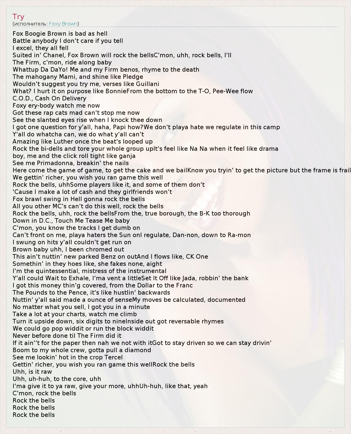 Fox Boogie Brown is bad as hell Battle anybody I don't care if you tell I excel, they all fell Suited in' Chanel, Fox Brown will rock the bellsC'mon, uhh, rock bells, I'll The Firm, c'mon, ride along baby Whattup Da DaYo! Me and my Firm benos, rhyme to the death The mahogany Mami, and shine like Pledge Wouldn't suggest you try me, verses like Guillani What? I hurt it on purpose like BonnieFrom the bottom to the T-O, Pee-Wee flow C.O.D., Cash On Delivery Foxy ery-body watch me now Got these rap cats mad can't stop me now See the slanted eyes rise when I knock thee down I got one question for y'all, haha, Papi how?We don't playa hate we regulate in this camp Y'all do whatcha can, we do what y'all can't Amazing like Luther once the beat's looped up Rock the bi-dells and tore your whole group upIt's feel like Na Na when it feel like drama boy, me and the click roll tight like ganja See me Primadonna, breakin' the nails Here come the game of game, to get the cake and we bailKnow you tryin' to get the picture but the frame is frail We gettin' richer, you wish you ran game this well Rock the bells, uhhSome players like it, and some of them don't 'Cause I make a lot of cash and they girlfriends won't Fox brawl swing in Hell gonna rock the bells All you other MC's can't do this well, rock the bells Rock the bells, uhh, rock the bellsFrom the, true borough, the B-K too thorough Down in D.C., Touch Me Tease Me baby C'mon, you know the tracks I get dumb on Can't front on me, playa haters the Sun onI regulate, Dan-non, down to Ra-mon I swung on hits y'all couldn't get run on Brown baby uhh, I been chromed out This ain't nuttin' new parked Benz on outAnd I flows like, CK One Somethin' in they hoes like, she fakes none, aight I'm the quintessential, mistress of the instrumental Y'all could Wait to Exhale, I'ma vent a littleSet It Off like Jada, robbin' the bank I got this money thin'g covered, from the Dollar to the Franc The Pounds to the Pence, it's like hustlin' backwards Nuttin' y'all said made a ounce of senseMy moves be calculated, documented No matter what you sell, I got you in a minute Take a lot at your charts, watch me climb Turn it upside down, six digits to nineInside out got reversable rhymes We could go pop widdit or run the block widdit Never before done til The Firm did it If it ain''t for the paper then nah we not with itGot to stay driven so we can stay drivin' Boom to my whole crew, gotta pull a diamond See me lookin' hot in the crop Tercel Gettin' richer, you wish you ran game this wellRock the bells Uhh, is it raw Uhh, uh-huh, to the core, uhh I'ma give it to ya raw, give your more, uhhUh-huh, like that, yeah C'mon, rock the bells Rock the bells Rock the bells Rock the bells