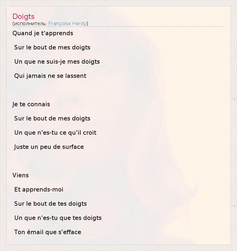 Это интересно:Уроженка Парижа, Франсуаза Арди (17.01.1944) воспитывалась в интернате для девочек La Bruyere, где и начала писать свои первые песни.В конце 50-х девушка поступила в Petit Conservatoire de Mireille, в то же время занимаясь в Сорбонне политологией (позже перевелась на филологический факультет) и время от времени посещая прослушивания в различных звукозаписывающих студиях. Удача улыбнулась Франсуазе в 1961 году,... продолжение