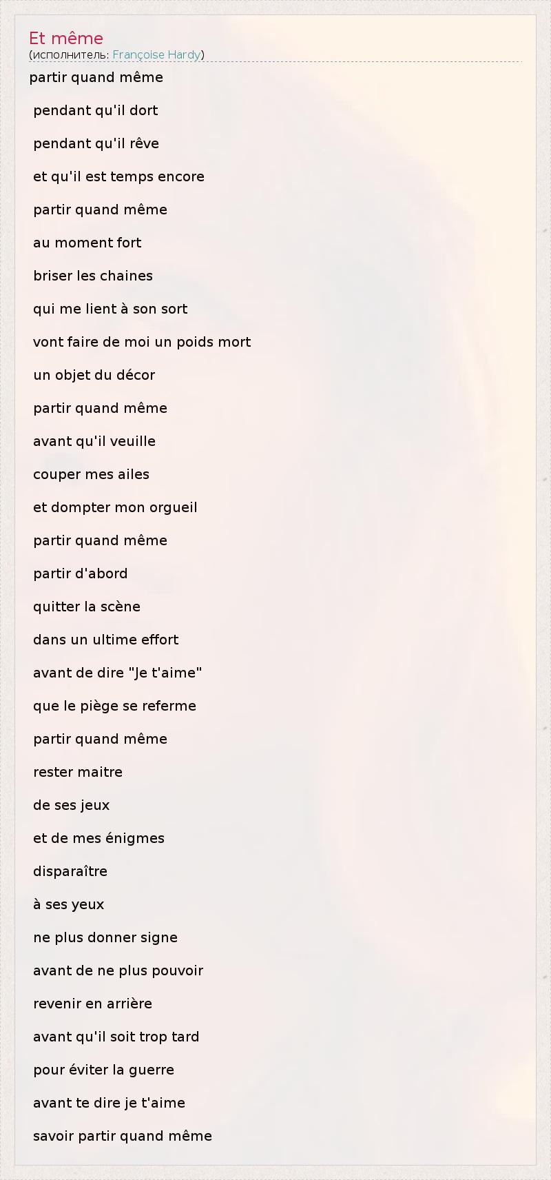 partir quand même pendant qu'il dort pendant qu'il rêve et qu'il est temps encore partir quand même au moment fort briser les chaines qui me lient à son sort vont faire de moi un poids mort un objet du décor partir quand même avant qu'il veuille couper mes ailes et dompter mon orgueil partir quand même partir d'abord quitter la scène dans un ultime effort avant de dire "Je t'aime" que le piège se referme partir quand même rester maitre de ses jeux et de mes énigmes disparaître à ses yeux ne plus donner signe avant de ne plus pouvoir revenir en arrière avant qu'il soit trop tard pour éviter la guerre avant te dire je t'aime savoir partir quand même