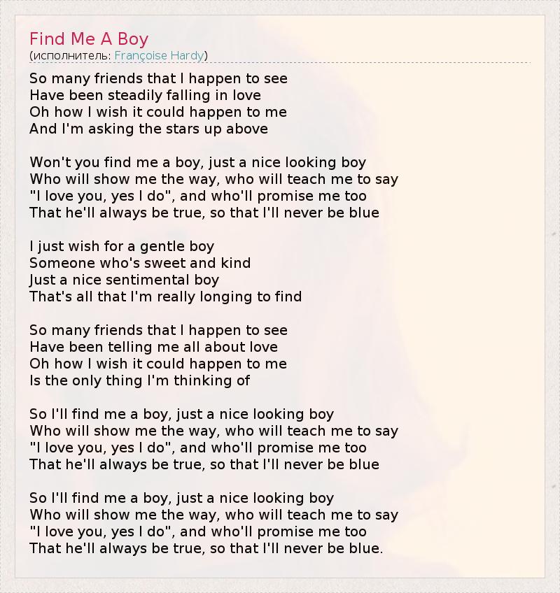 So many friends that I happen to see Have been steadily falling in love Oh how I wish it could happen to me And I'm asking the stars up above Won't you find me a boy, just a nice looking boy Who will show me the way, who will teach me to say "I love you, yes I do", and who'll promise me too That he'll always be true, so that I'll never be blue I just wish for a gentle boy Someone who's sweet and kind Just a nice sentimental boy That's all that I'm really longing to find So many friends that I happen to see Have been telling me all about love Oh how I wish it could happen to me Is the only thing I'm thinking of So I'll find me a boy, just a nice looking boy Who will show me the way, who will teach me to say "I love you, yes I do", and who'll promise me too That he'll always be true, so that I'll never be blue So I'll find me a boy, just a nice looking boy Who will show me the way, who will teach me to say "I love you, yes I do", and who'll promise me too That he'll always be true, so that I'll never be blue.