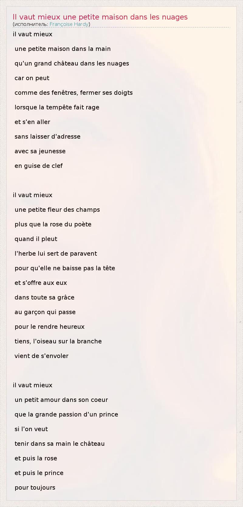 ГлавнаяИсполнителиFrançoise HardyIl vaut mieux une petite maison dans les nuages