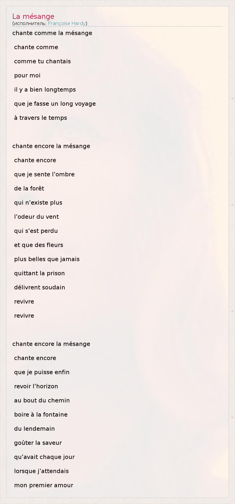 Это интересно:Уроженка Парижа, Франсуаза Арди (17.01.1944) воспитывалась в интернате для девочек La Bruyere, где и начала писать свои первые песни.В конце 50-х девушка поступила в Petit Conservatoire de Mireille, в то же время занимаясь в Сорбонне политологией (позже перевелась на филологический факультет) и время от времени посещая прослушивания в различных звукозаписывающих студиях. Удача улыбнулась Франсуазе в 1961 году,... продолжение