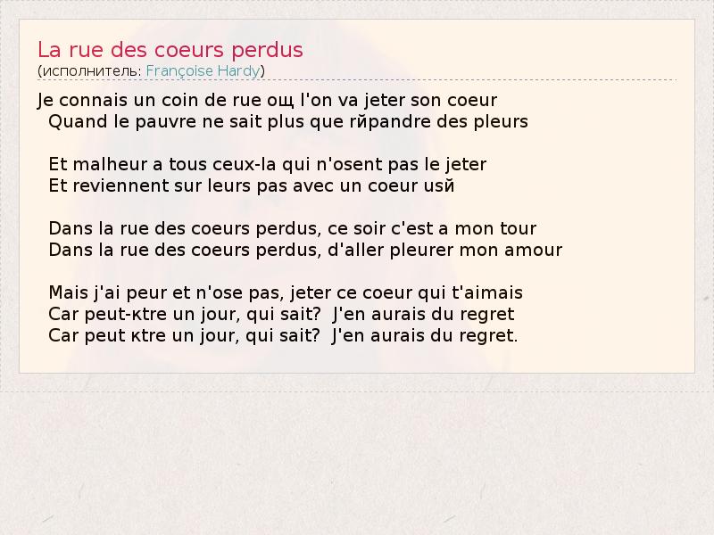 А как ты думаешь, о чем песня "La rue des coeurs perdus" ?