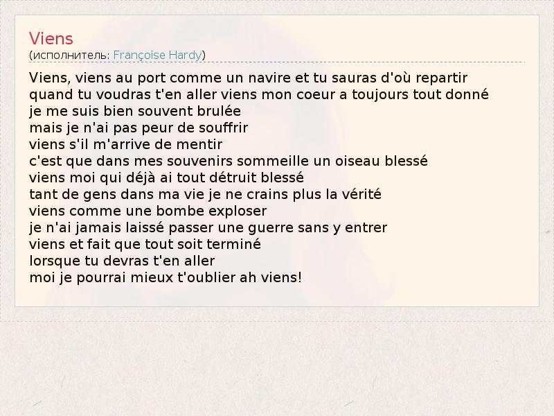 Это интересно:Уроженка Парижа, Франсуаза Арди (17.01.1944) воспитывалась в интернате для девочек La Bruyere, где и начала писать свои первые песни.В конце 50-х девушка поступила в Petit Conservatoire de Mireille, в то же время занимаясь в Сорбонне политологией (позже перевелась на филологический факультет) и время от времени посещая прослушивания в различных звукозаписывающих студиях. Удача улыбнулась Франсуазе в 1961 году,... продолжение