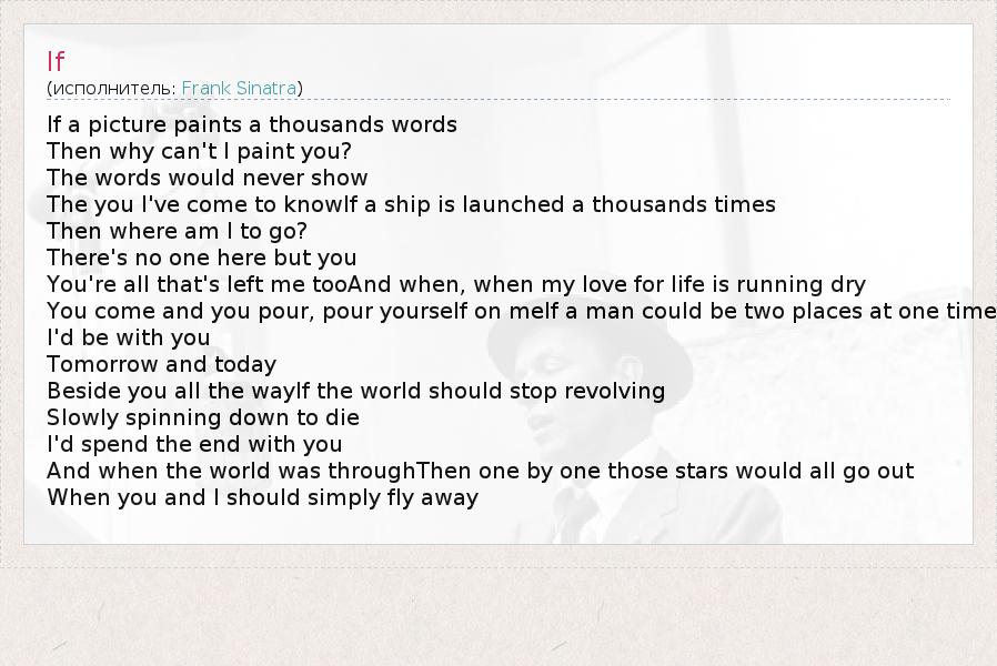 Это интересно:Фрэнк Синатра так давно и несокрушимо возглавляет списки самых-самых (песен, артистов, голосов и так далее), что больше напоминает некое артистическое божество, чем живого человека. Его имя действительно первым приходит на ум, когда речь заходит о тех людях-символах, которые в массовом сознании безраздельно воплощают американскую музыкальную культуру. За всем изобилием изданных Синатрой... продолжение