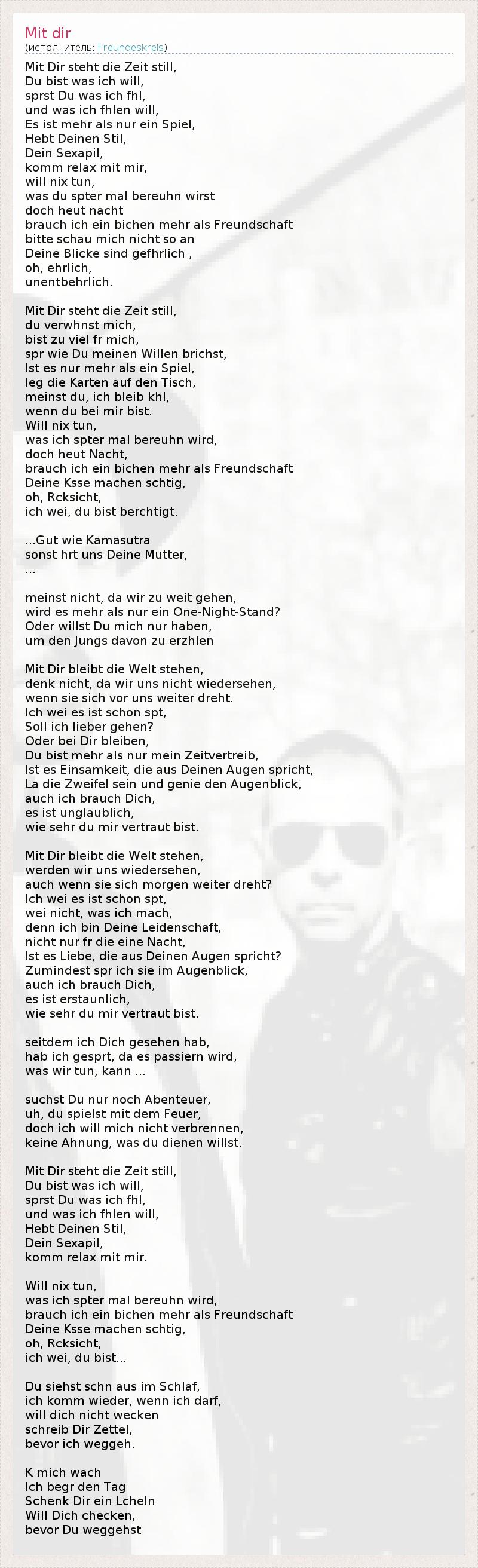Это интересно:Freundeskreis — немецкая хип-хоп группа из Штутгарта, распавшаяся в 2007 году и исполнявшая песни не только на родном языке, но и на английском, французском и языке Эсперанто. Участниками группы были: Max Herre, Don Philippe и DJ Friction. Многие тексты песен Freundeskreis посвящены политике, ребята выступали за равенство людей и международное взаимопонимание. После выпуска своего дебютного альбома под названием... продолжение
