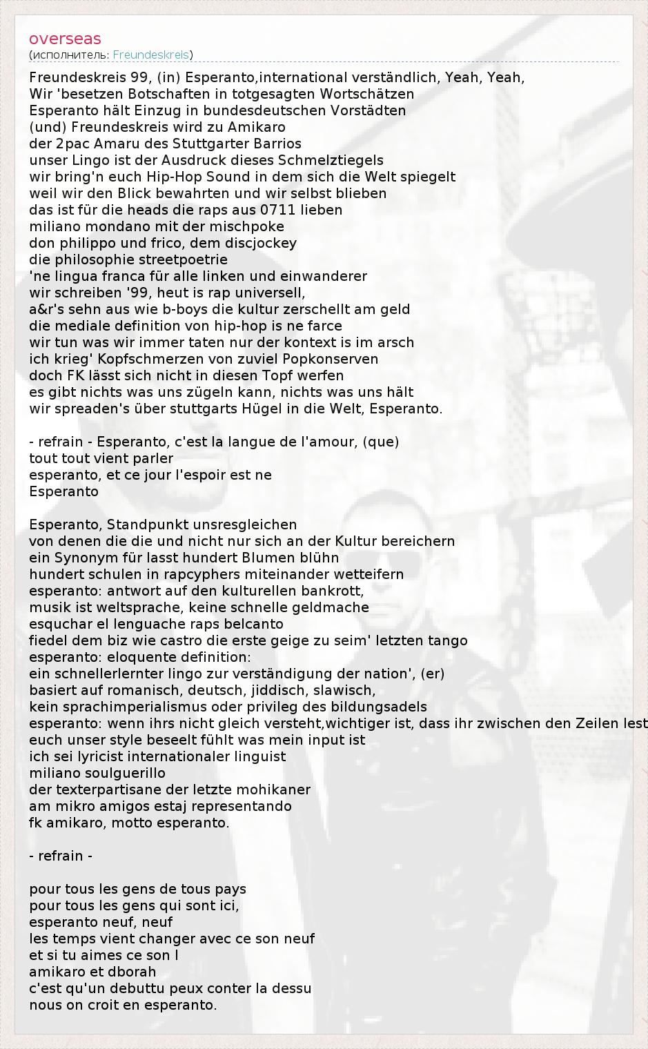 Freundeskreis 99, (in) Esperanto,international verständlich, Yeah, Yeah, Wir 'besetzen Botschaften in totgesagten Wortschätzen Esperanto hält Einzug in bundesdeutschen Vorstädten (und) Freundeskreis wird zu Amikaro der 2pac Amaru des Stuttgarter Barrios unser Lingo ist der Ausdruck dieses Schmelztiegels wir bring'n euch Hip-Hop Sound in dem sich die Welt spiegelt weil wir den Blick bewahrten und wir selbst blieben das ist für die heads die raps aus 0711 lieben miliano mondano mit der mischpoke don philippo und frico, dem discjockey die philosophie streetpoetrie 'ne lingua franca für alle linken und einwanderer wir schreiben '99, heut is rap universell, a&r's sehn aus wie b-boys die kultur zerschellt am geld die mediale definition von hip-hop is ne farce wir tun was wir immer taten nur der kontext is im arsch ich krieg' Kopfschmerzen von zuviel Popkonserven doch FK lässt sich nicht in diesen Topf werfen es gibt nichts was uns zügeln kann, nichts was uns hält wir spreaden's über stuttgarts Hügel in die Welt, Esperanto. - refrain - Esperanto, c'est la langue de l'amour, (que) tout tout vient parler esperanto, et ce jour l'espoir est ne Esperanto Esperanto, Standpunkt unsresgleichen von denen die die und nicht nur sich an der Kultur bereichern ein Synonym für lasst hundert Blumen blühn hundert schulen in rapcyphers miteinander wetteifern esperanto: antwort auf den kulturellen bankrott, musik ist weltsprache, keine schnelle geldmache esquchar el lenguache raps belcanto fiedel dem biz wie castro die erste geige zu seim' letzten tango esperanto: eloquente definition: ein schnellerlernter lingo zur verständigung der nation', (er) basiert auf romanisch, deutsch, jiddisch, slawisch, kein sprachimperialismus oder privileg des bildungsadels esperanto: wenn ihrs nicht gleich versteht,wichtiger ist, dass ihr zwischen den Zeilen lest euch unser style beseelt fühlt was mein input ist ich sei lyricist internationaler linguist miliano soulguerillo der texterpartisane der letzte mohikaner am mikro amigos estaj representando fk amikaro, motto esperanto. - refrain - pour tous les gens de tous pays pour tous les gens qui sont ici, esperanto neuf, neuf les temps vient changer avec ce son neuf et si tu aimes ce son l amikaro et dborah c'est qu'un debuttu peux conter la dessu nous on croit en esperanto.