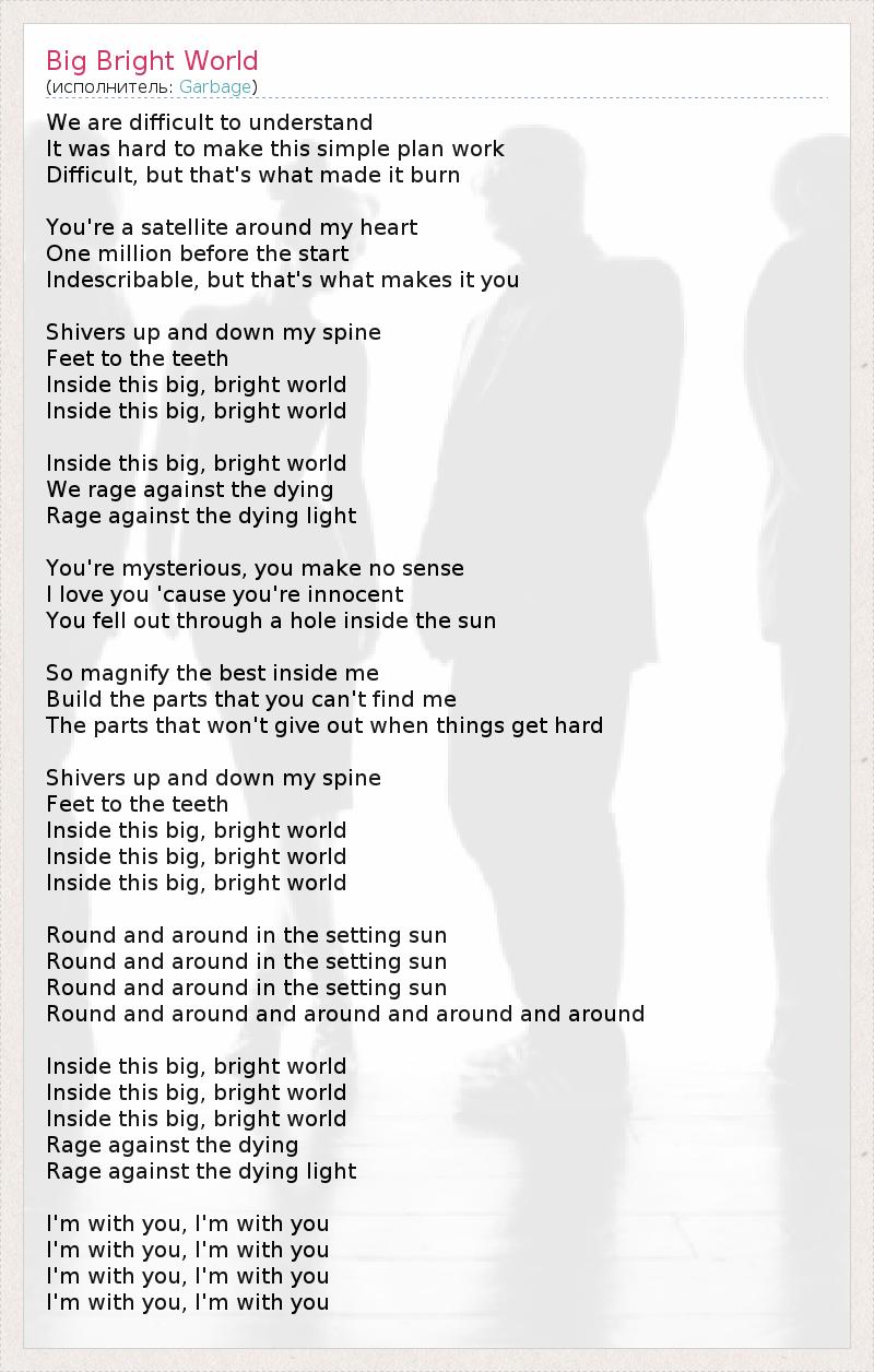 We are difficult to understand It was hard to make this simple plan work Difficult, but that's what made it burn You're a satellite around my heart One million before the start Indescribable, but that's what makes it you Shivers up and down my spine Feet to the teeth Inside this big, bright world Inside this big, bright world Inside this big, bright world We rage against the dying Rage against the dying light You're mysterious, you make no sense I love you 'cause you're innocent You fell out through a hole inside the sun So magnify the best inside me Build the parts that you can't find me The parts that won't give out when things get hard Shivers up and down my spine Feet to the teeth Inside this big, bright world Inside this big, bright world Inside this big, bright world Round and around in the setting sun Round and around in the setting sun Round and around in the setting sun Round and around and around and around and around Inside this big, bright world Inside this big, bright world Inside this big, bright world Rage against the dying Rage against the dying light I'm with you, I'm with you I'm with you, I'm with you I'm with you, I'm with you I'm with you, I'm with you
